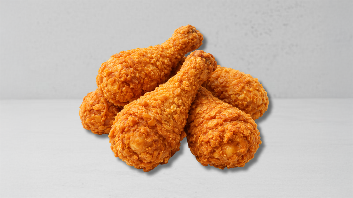 6 frisch panierte Unterkeule mit Pommes oder Reis 3 Soßen und 1 Getränk