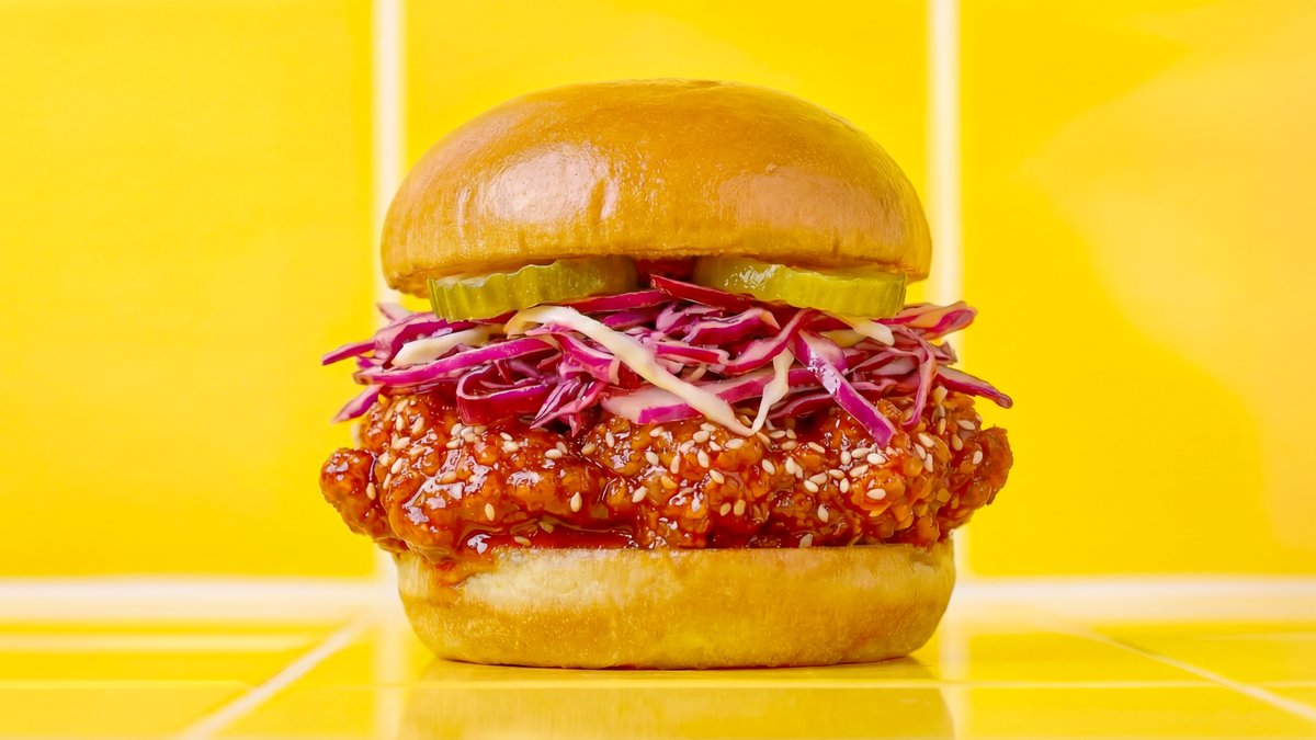 Kleiner Brioche Bun mit knusprigem Fried Chicken, Sweet-Chili-Soße, Krautsalat, Cremesoße, Sauergurken und Sesam