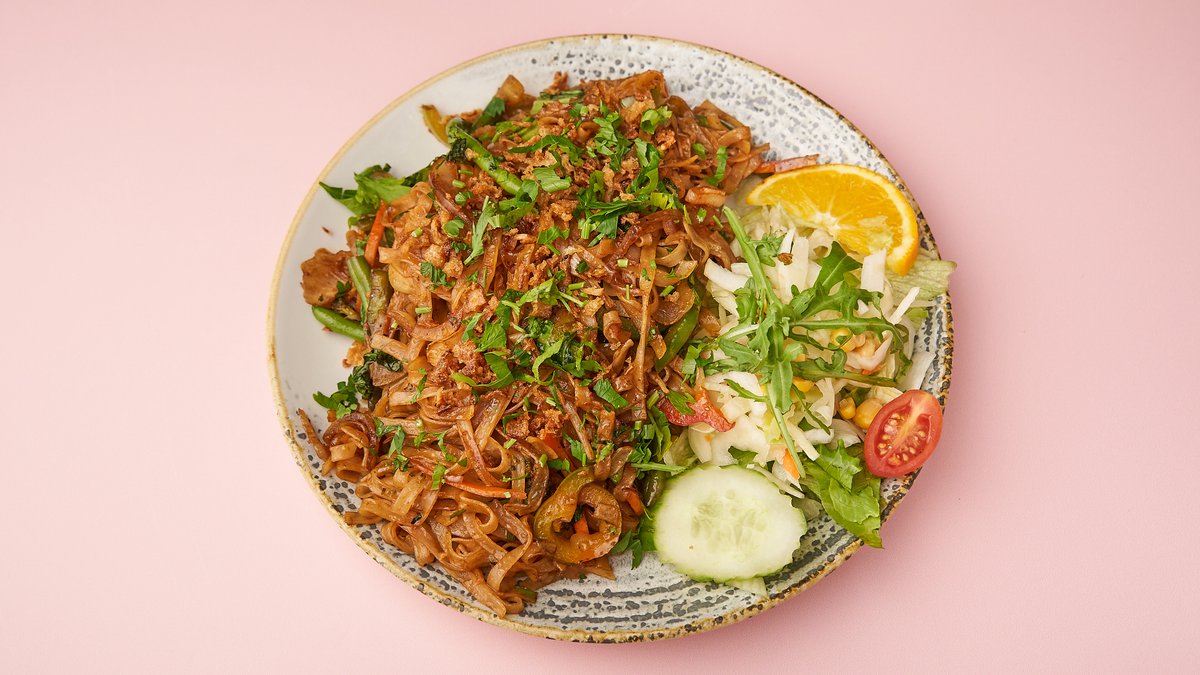 gebratene Reisnudeln mit Gemüse, Sojasprossen, Paprika und Tofu