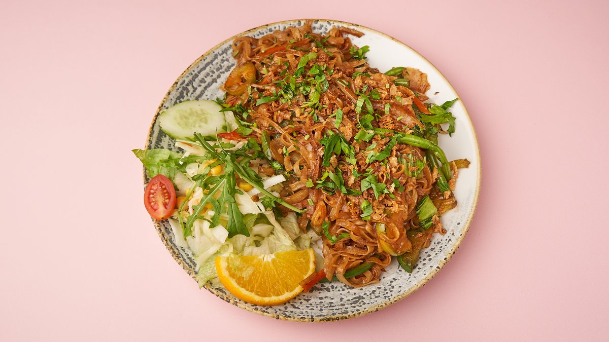 gebratene Reisnudeln mit gegrilltem Hähnchen, Sojasprossen und Zwiebeln