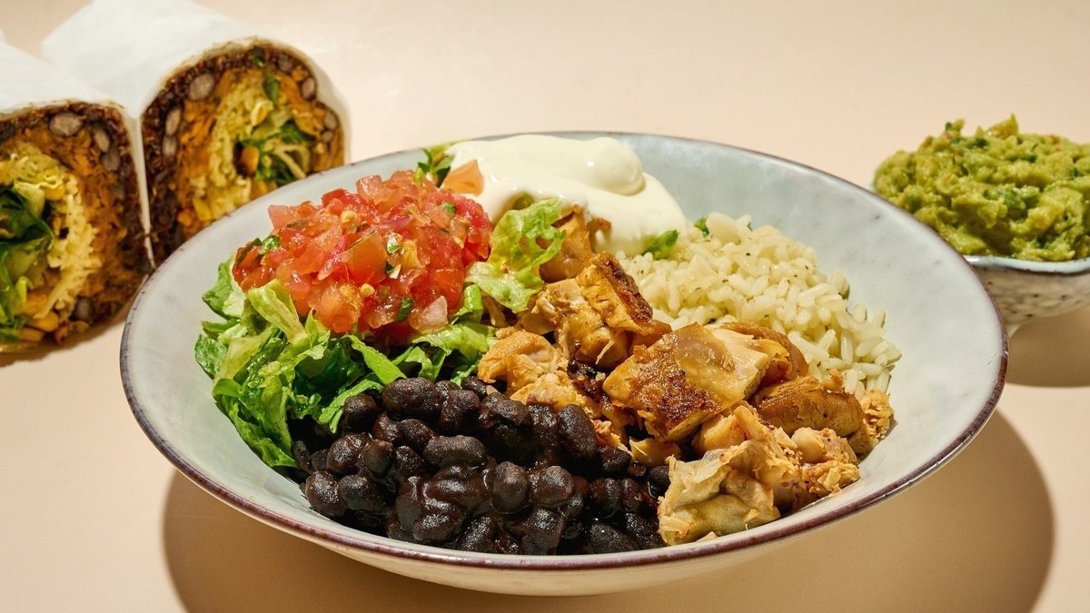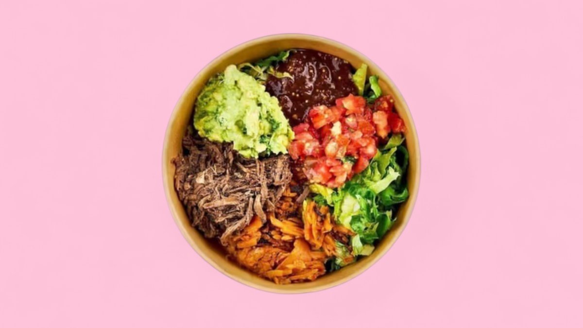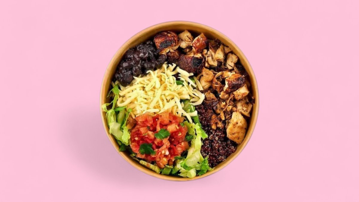 Bowl mit - doppelter Portion Hähnchen- oder Rindfleisch - Quinoa - Bohnen - Käse - Pico de Gallo Tomatensalsa - Salat - Guacamole optional (mit Aufpreis) 78g Eiweiss | 17g Ballaststoffe | 945 kcal.