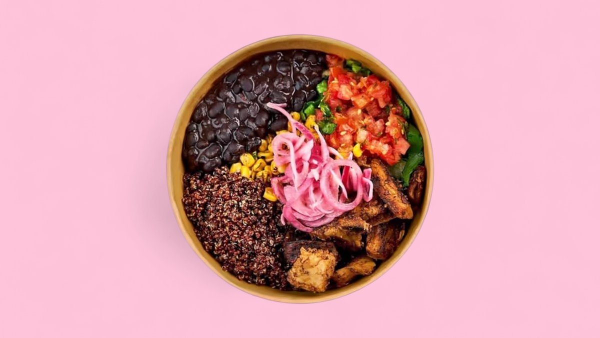 Bowl mit - doppelter Portion Planted Chicken - Quinoa - Bohnen - Salat - Pico de Gallo & Chili Mais - eingelegten Zwiebeln - optionaler Guacamole (mit Aufpreis) Vegan | 68g Eiweiss | 28g Ballaststoffe | 752 kcal.