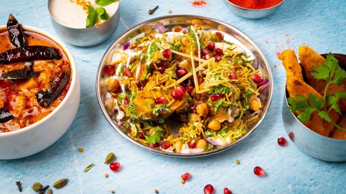 knusprige Samosa, mit Sev, Honig-Joghurt, Koriander, Tamarinden-Chutney und Granatapfel überzogen