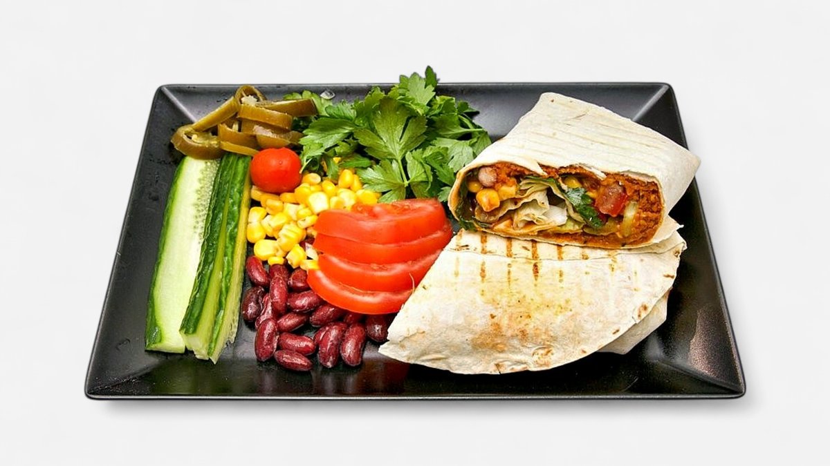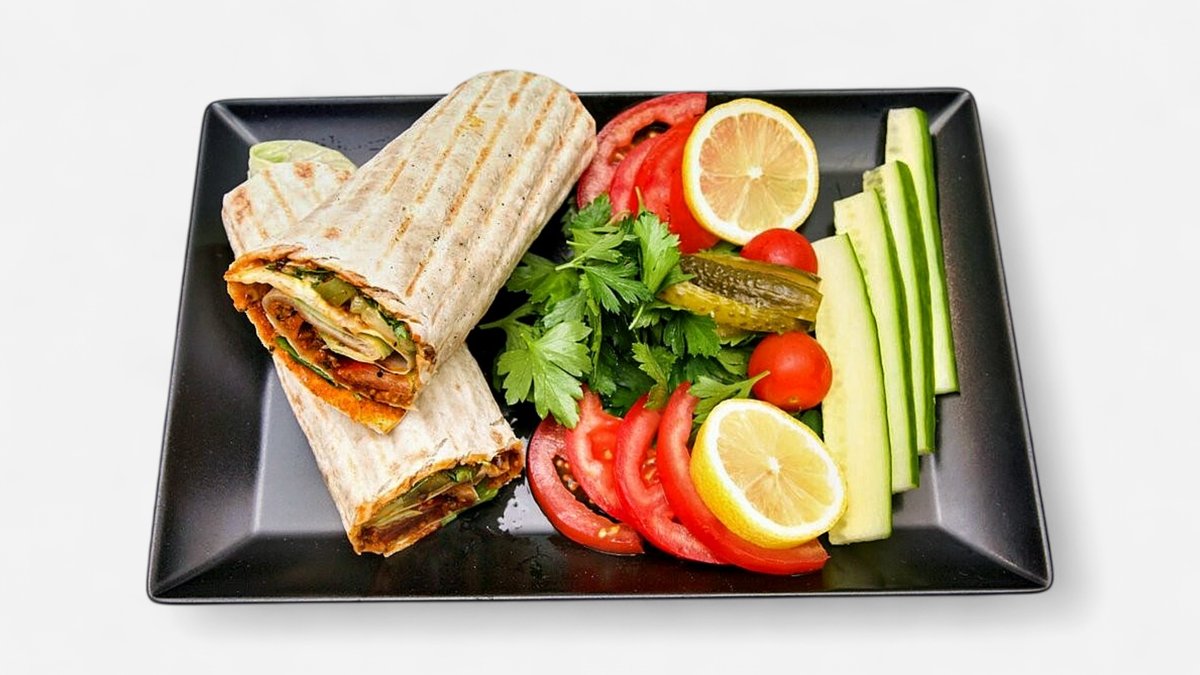 alle Wraps werden mit Gurken, Minze, Petersilie, Tomaten, Gewürzgurken, Frühlingszwiebeln, Granatapfelsoße, Eisbergsalat und einer Zutat deiner Wahl zubereitet