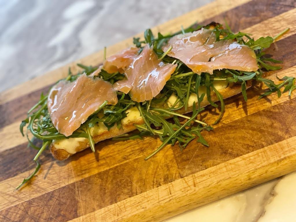 mit Mozzarella, Öl, Rucola und frischem Lachs