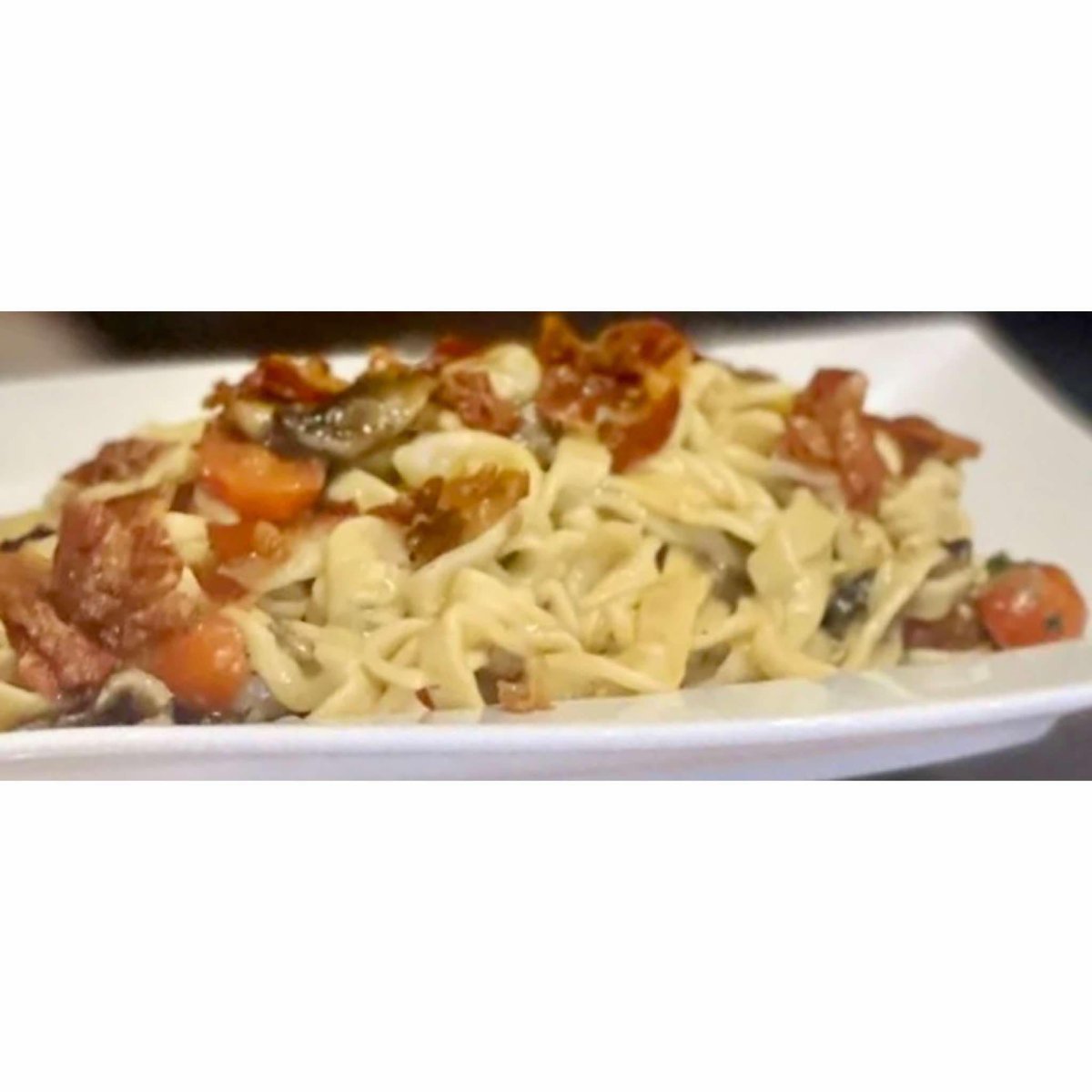 mit Guanciale, Cherrytomaten, Champignons und Parmesan