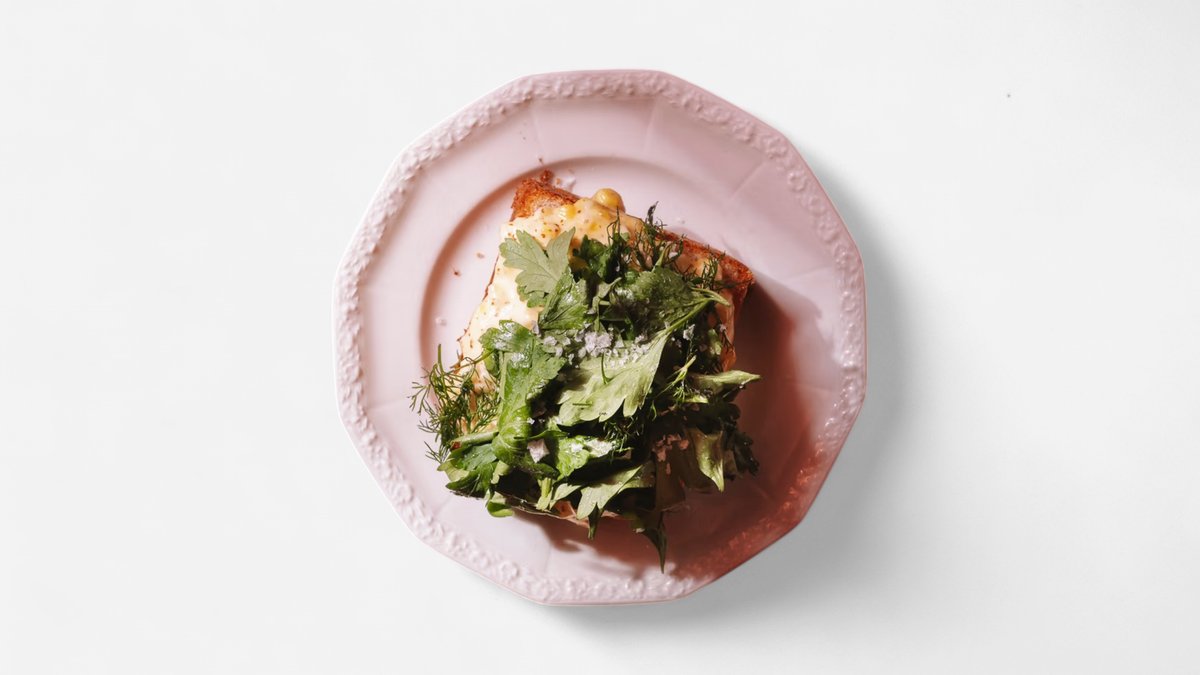 mit Sauerteig-Brioche, Eiersalat, Kräutersalat, Zitrone und Olivenöl