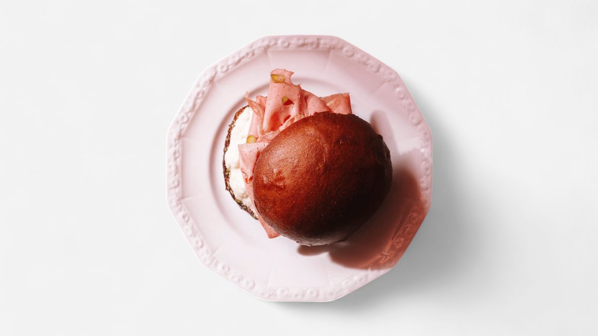 Mit Sauerteig-Brioche, hausgemachtem Pesto, karamellisierten Zwiebeln, Mortadella von der Blutwurstmanufaktur und hausgemachter Stracciatella