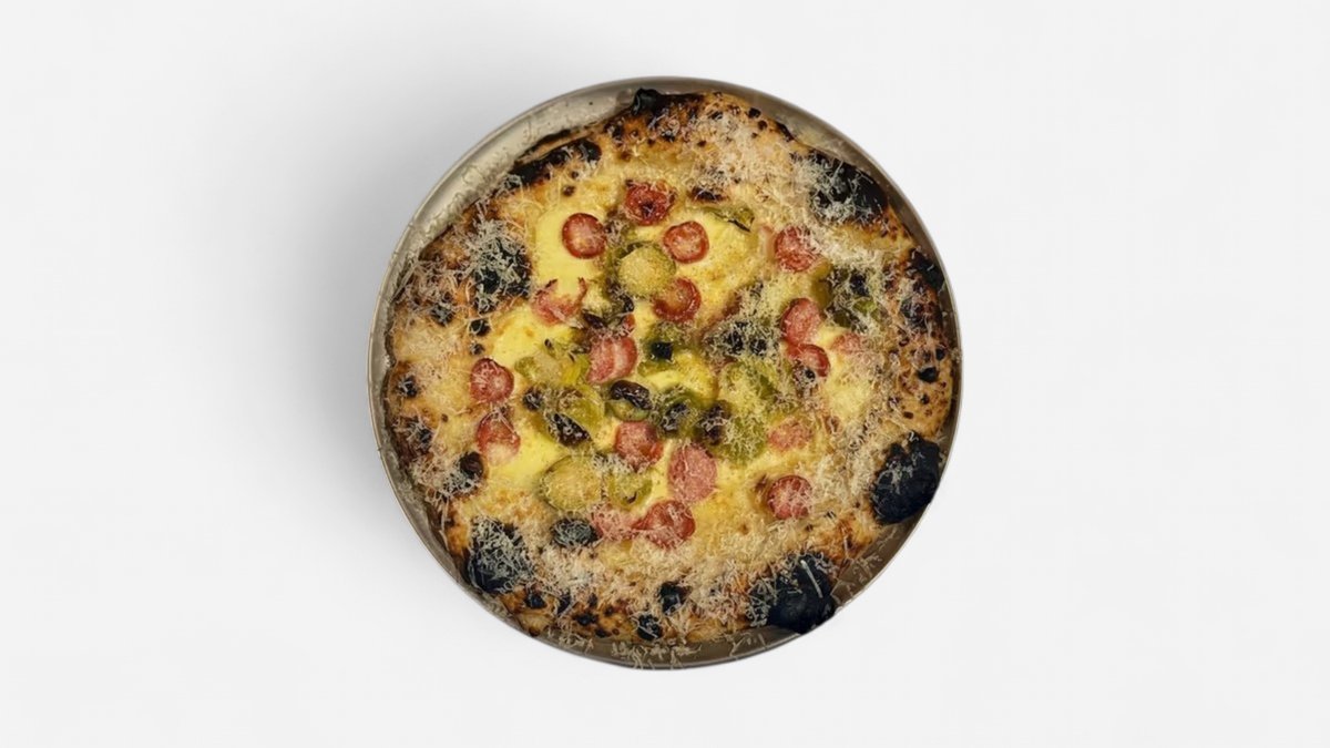 Charred Pistaccho Mortadella from Blutwurstmanufaktur, Fermented Chilli Sauce, Mozzarella from Berlin, Nordsee Cheese