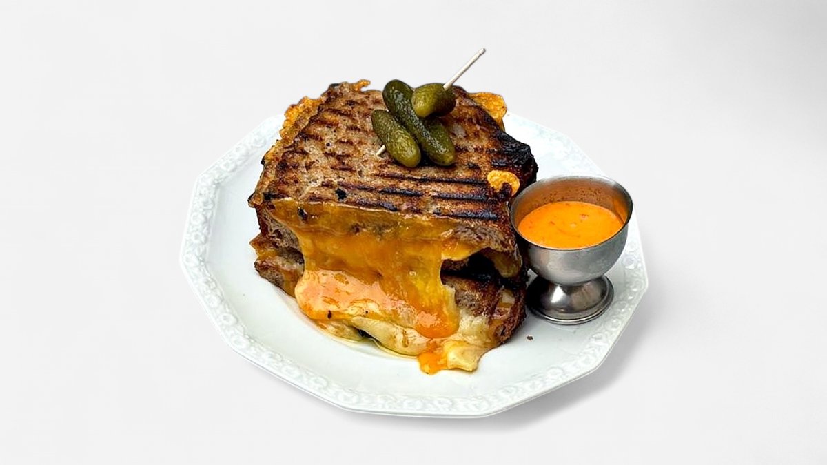 mit Nordseekäse, Cheddarkäse, Zwiebel-Chutney und Béchamel