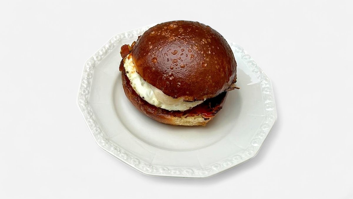 Mit Sauerteig-Brioche, Bio-Spiegelei, Chicken Salt, BBQ-Sauce, knusprigem Bacon von der Blutwurstmanufaktur und Ketchup.