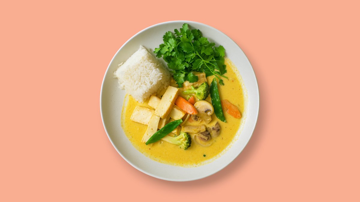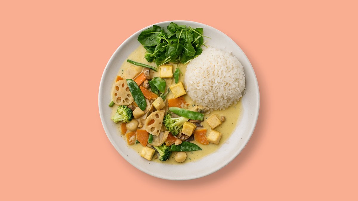 alle Gerichte werden mit einer Zutat deiner Wahl, Kokosmilch und verschiedenem Saison GemĂŒse zubereitet und mit Duftreis und Salat serviert