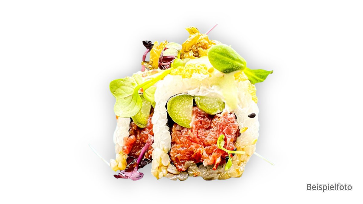 jede Portion enthält 8 Stück und wird mit Avocado zubereitet und mit Tobiko und Sesam ummantelt („221. Tuna Inside Out” wird ohne Avocado zubereitet)