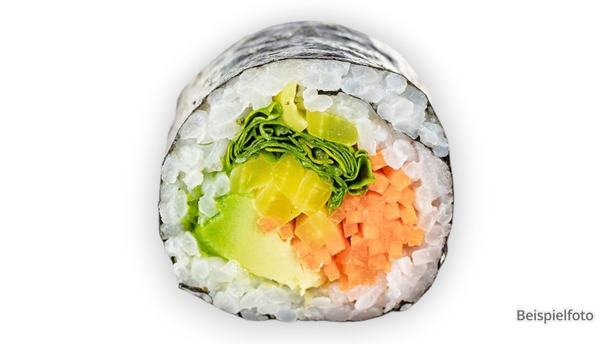 jede Portion enthält 8 Stück und wird mit Avocado, Gurken und Frischkäse zubereitet und mit Cozy Soße und Sesam serviert („253. Vegan Roll” wird ohne Frischkäse zubereitet)