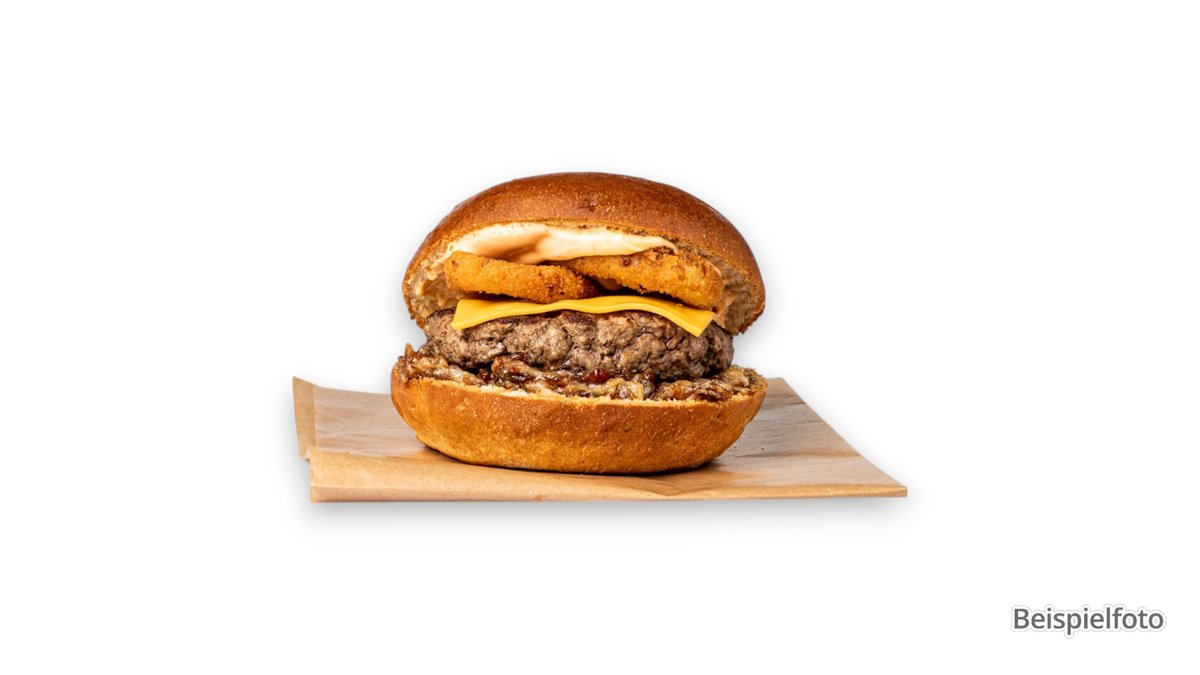 mit Speck vom Rind, Spezialsoße, Zwiebelringen, Cheddar, Barbecuesoße und Röstzwiebeln