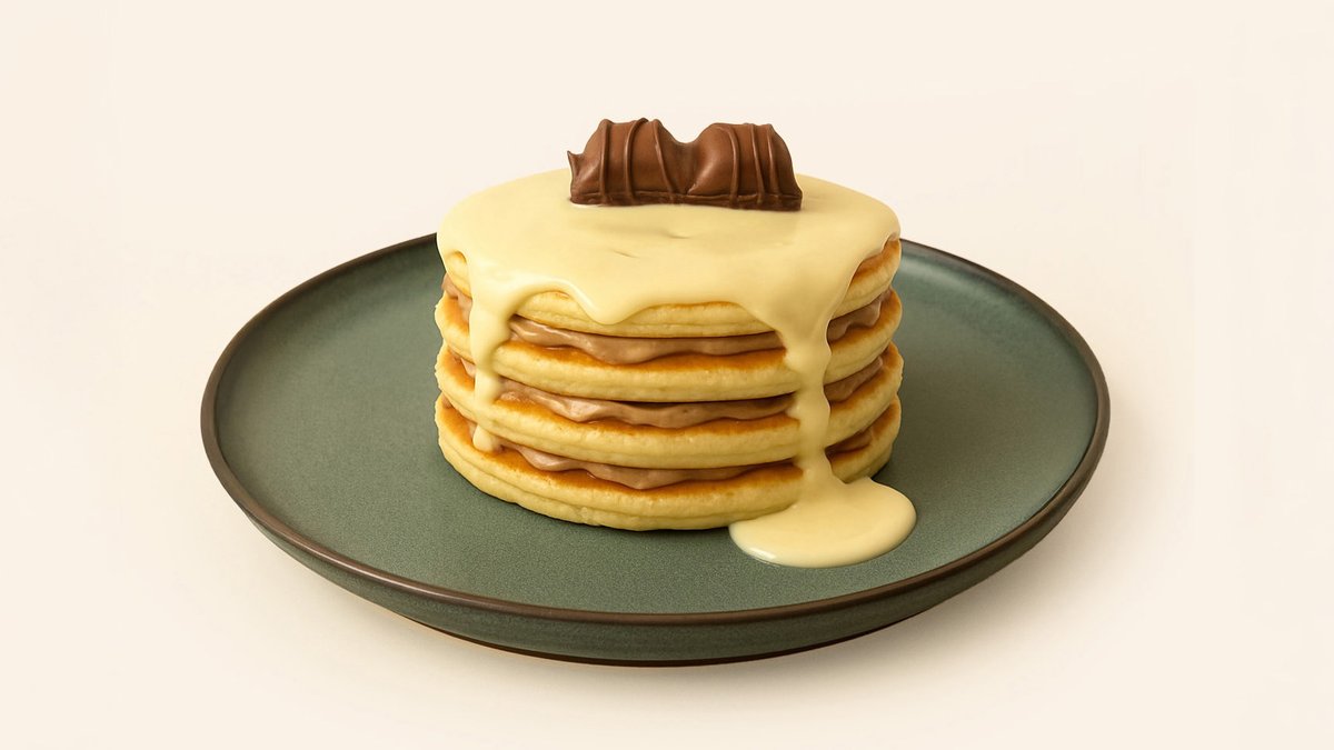 fluffige Pancakes in 4 Schichten, gefüllt mit zarter Bueno Creme und überzogen mit cremiger weißer Schokolade und getoppt mit einem Stück Kinder Bueno