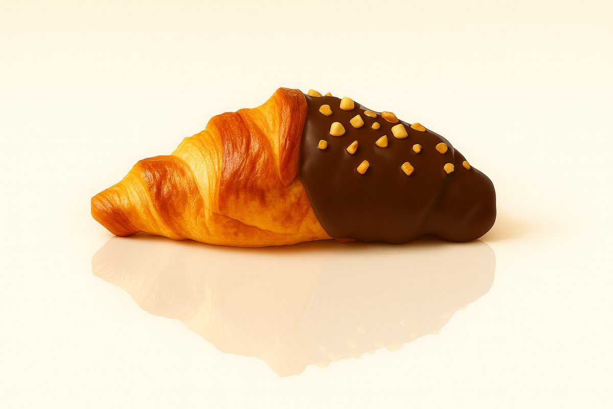 frisches Butter Croissant, veredelt mit belgischer Vollmilchschokolade und Toppings nach Wahl Das Gericht wurde mit Schokolade zubereitet und kann Spuren von verschiedenen Nüssen enthalten