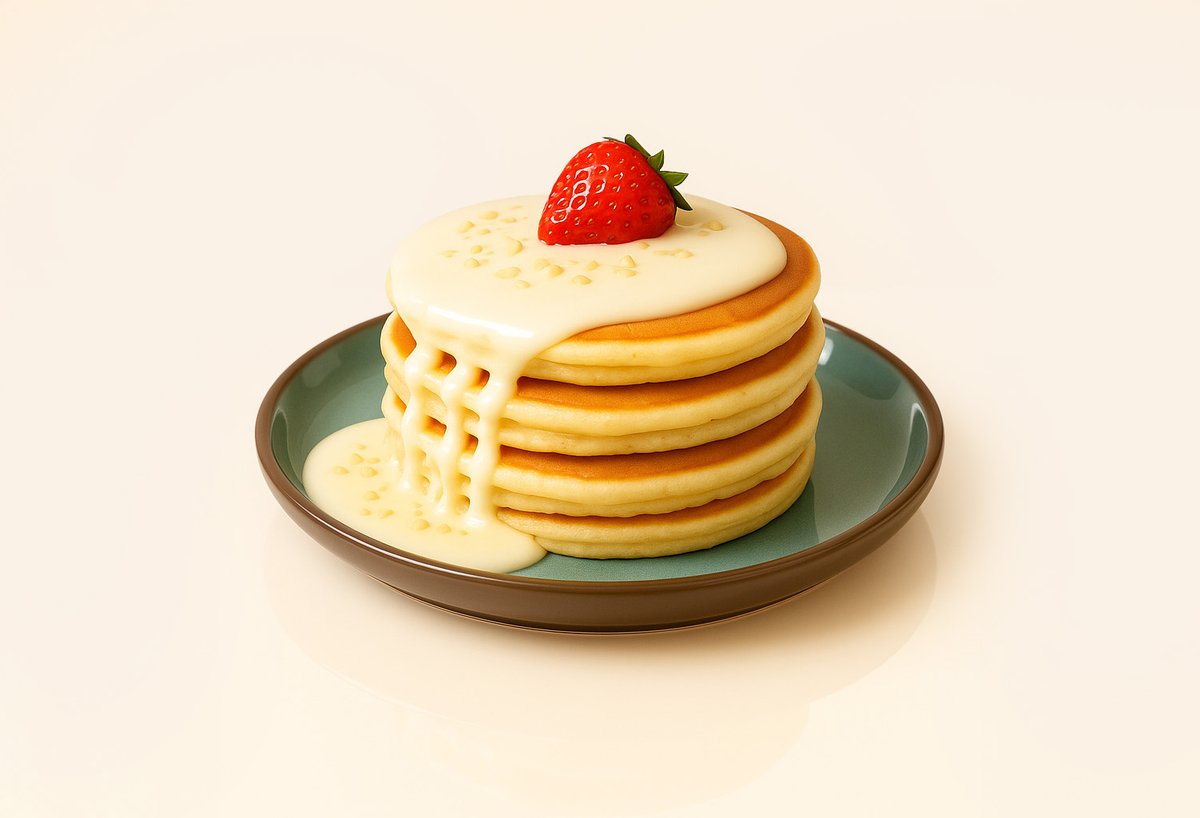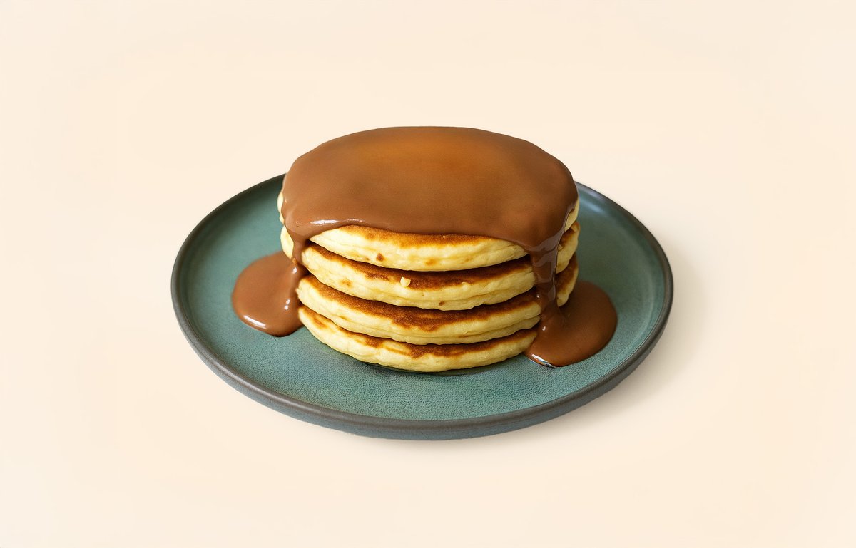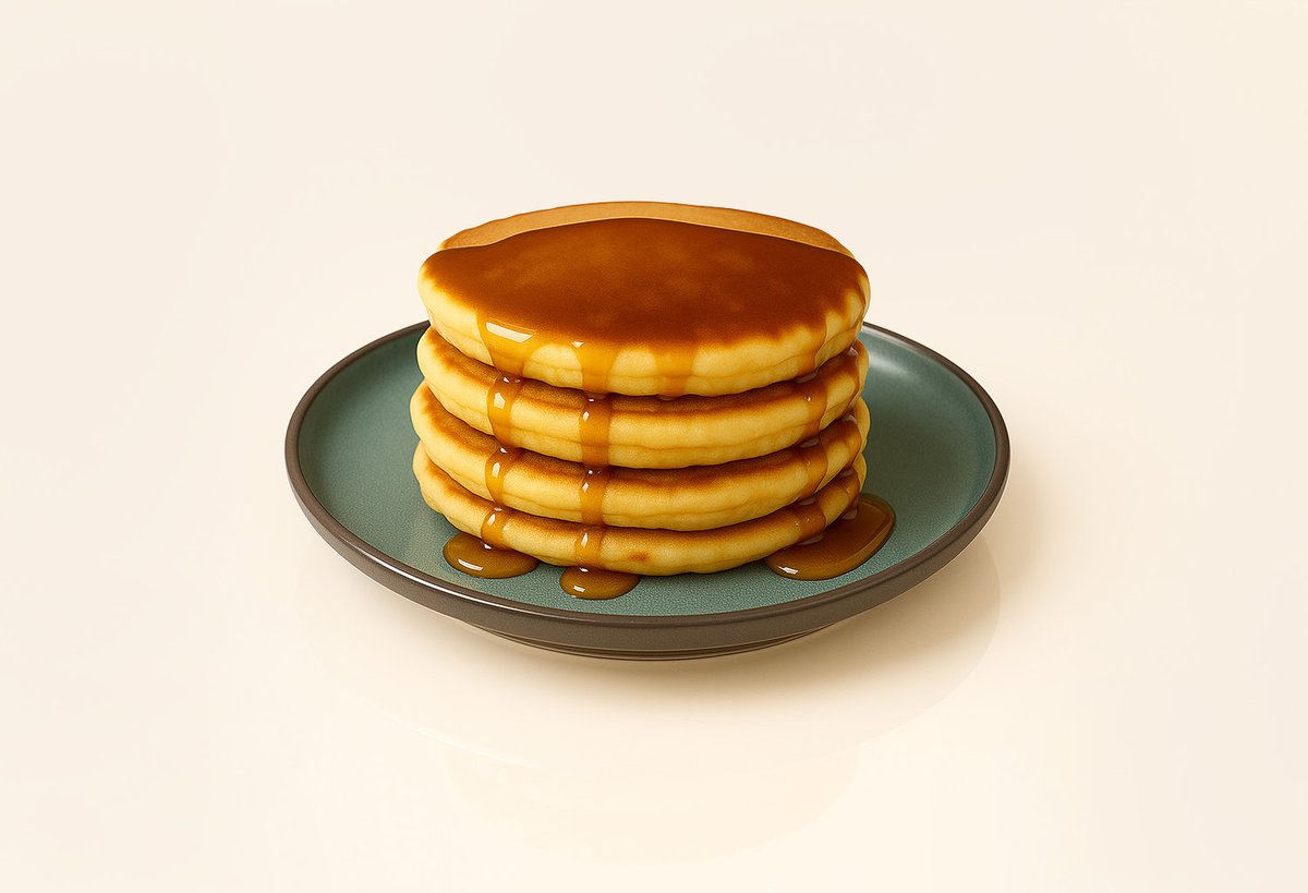 fluffige Pancakes in vier Schichten, jede Lage liebevoll mit feinem Ahornsirup bestrichen für den perfekten, natürlichen Geschmack, serviert mit einem zusätzlichen kleinen Behälter voll Ahornsirup zum Selbstverfeinern