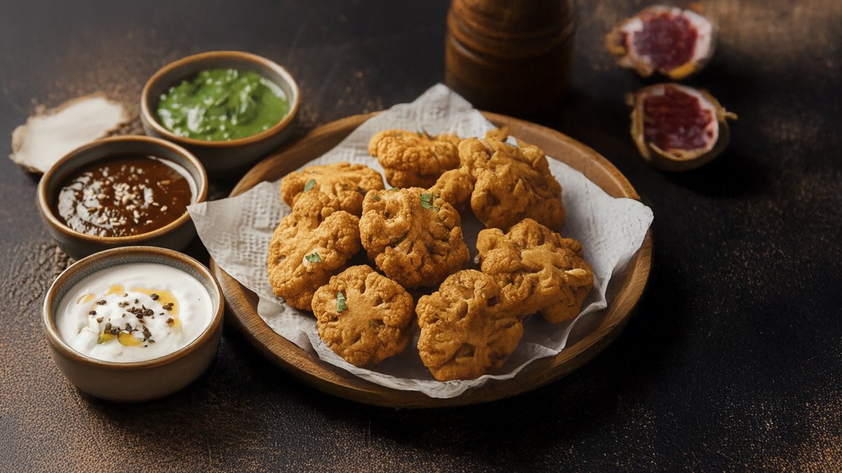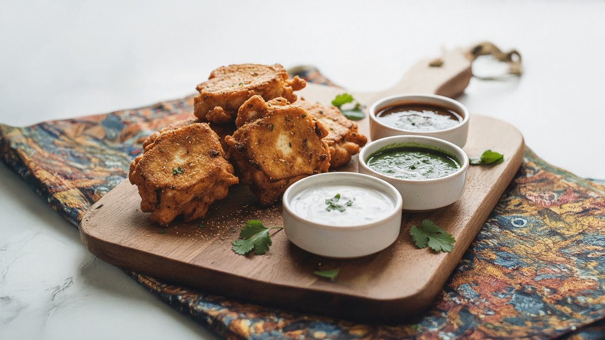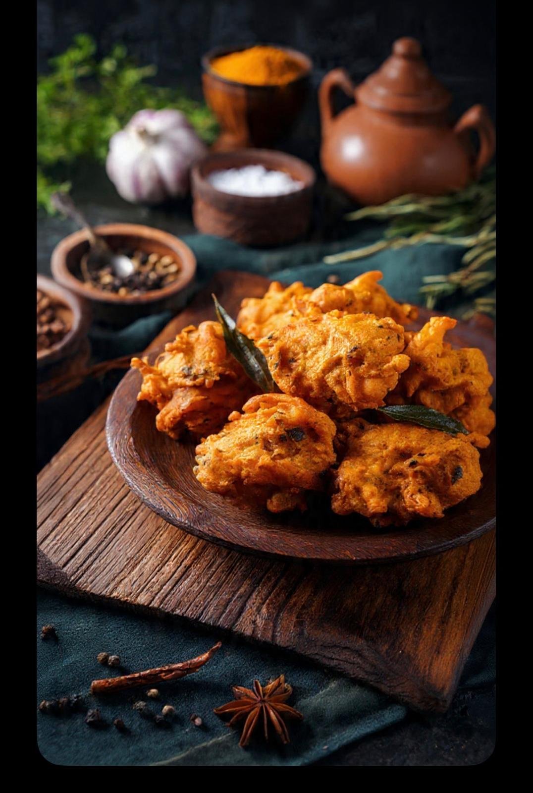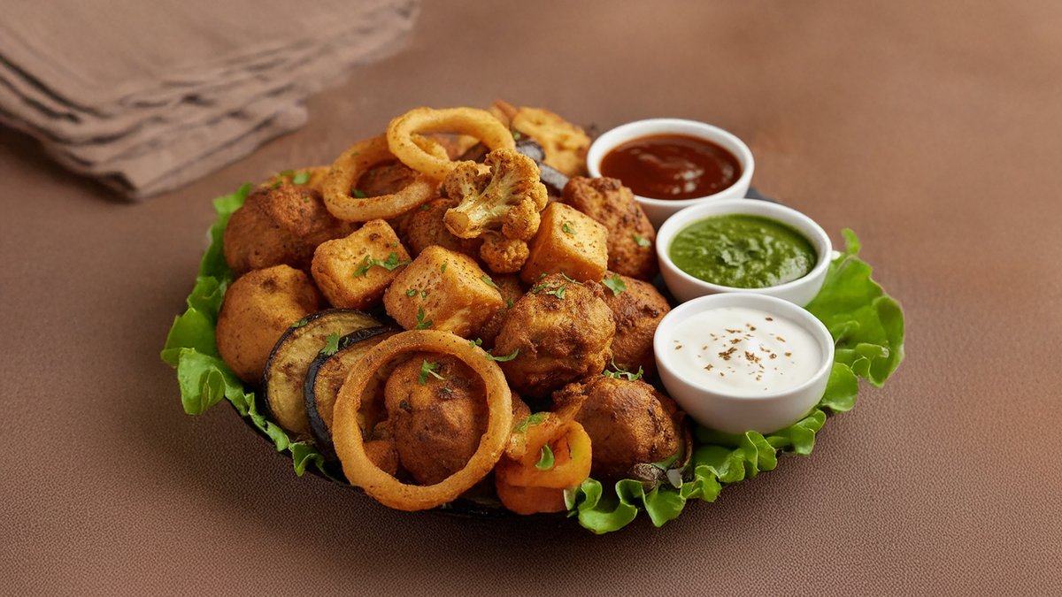 alle warmen Vorspeisen werden mit drei verschiedenen Saucen (Jogurt, Tamarind und Minz) serviert. die Pakoras werden in Kichererbsenmehl gewendet und fritiert.