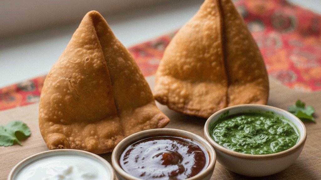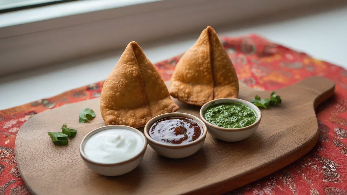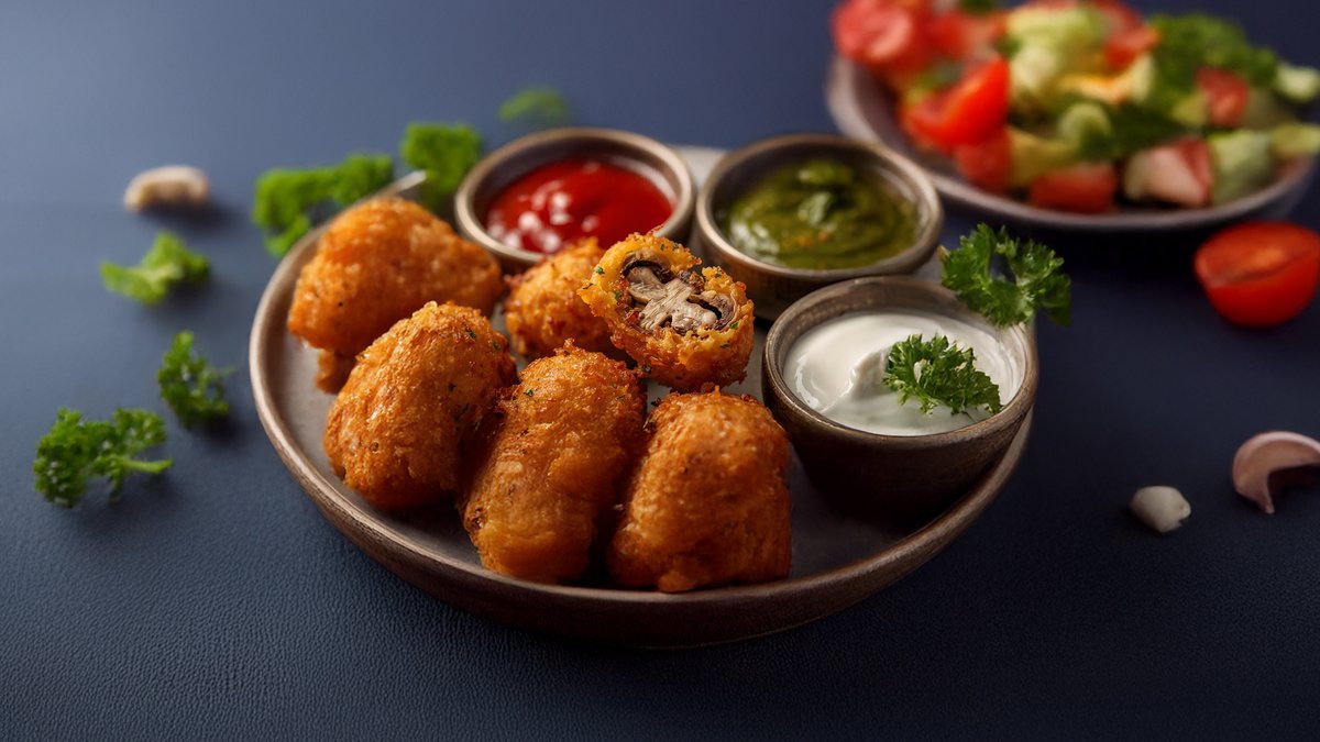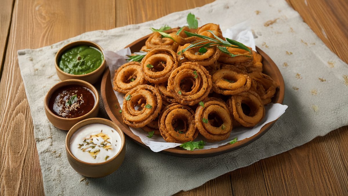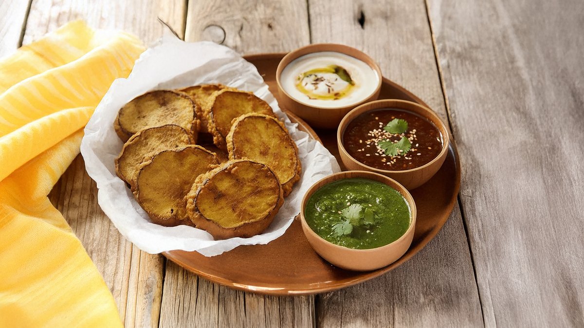 alle warmen Vorspeisen werden mit drei verschiedenen Saucen (Jogurt, Tamarind und Minz) serviert. die Pakoras werden in Kichererbsenmehl gewendet und fritiert.