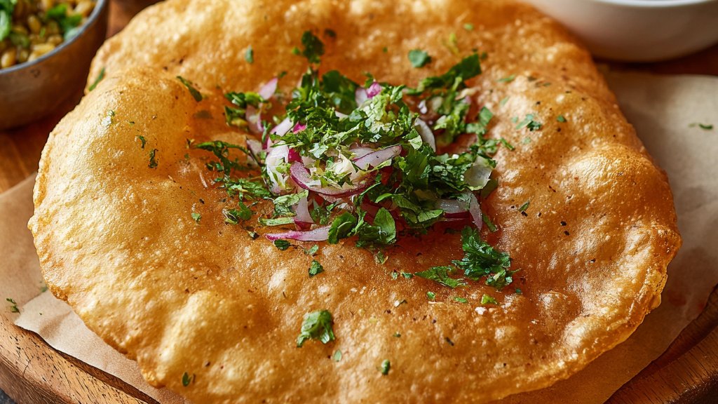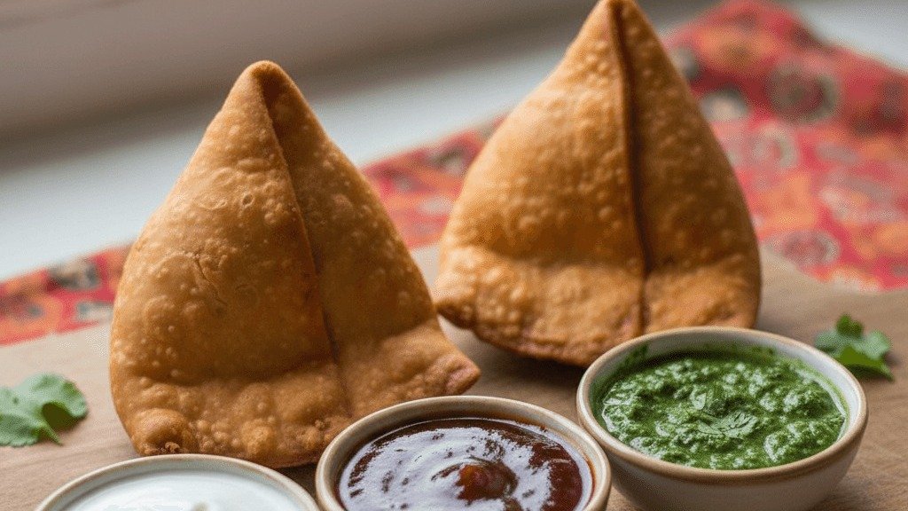 zwei Gemüse-Teigtaschen gefüllt mit Kartoffeln, Erbsen, Rosinen und Mandeln