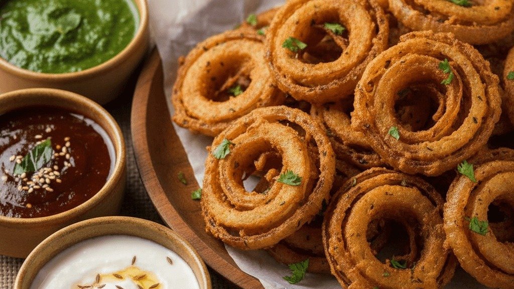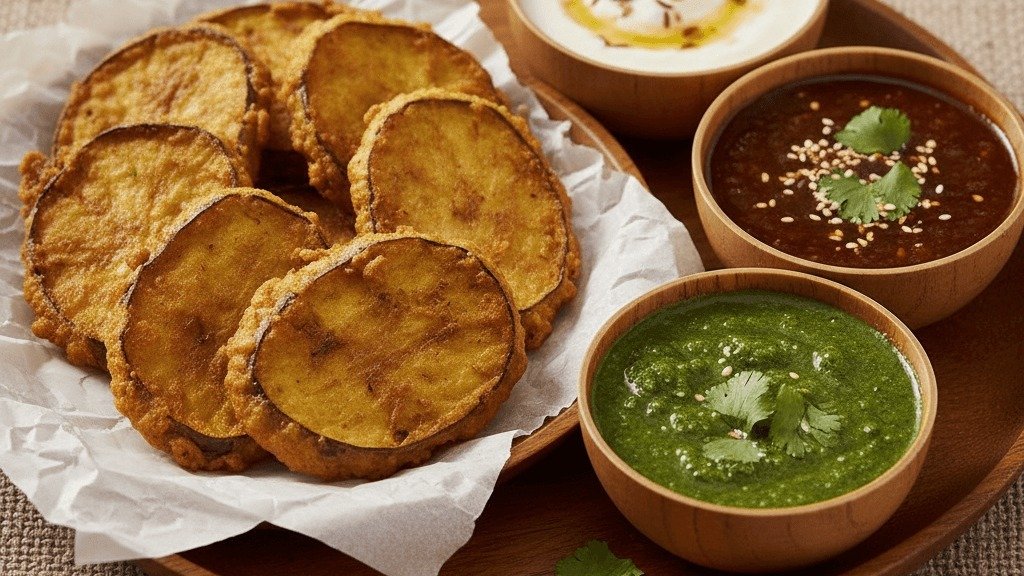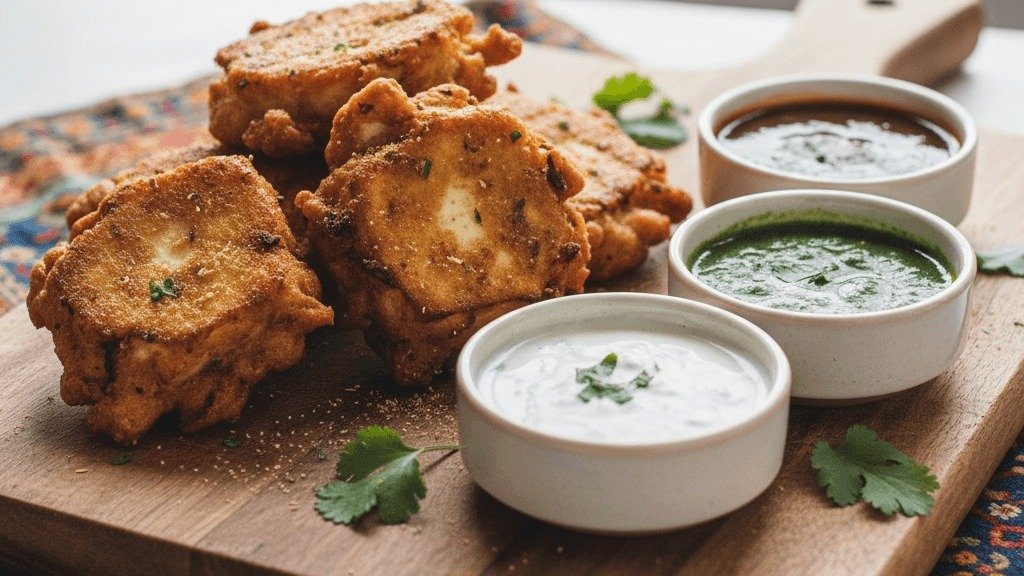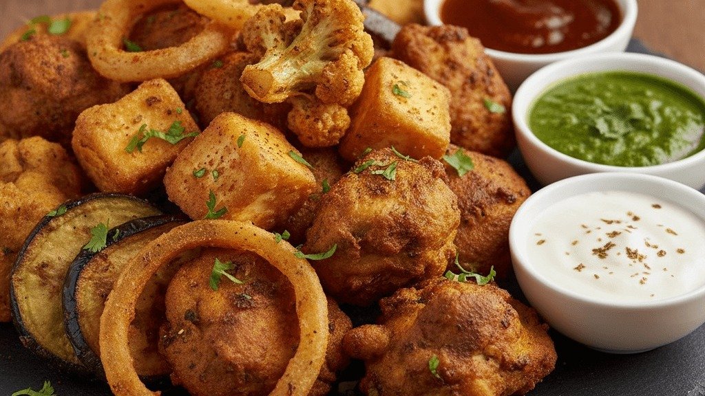 warmen Vorspeisen werden mit drei verschiedenen Saucen (Jogurt, Tamarind und Minz) serviert. die Pakoras werden in Kichererbsenmehl gewendet und fritiert.