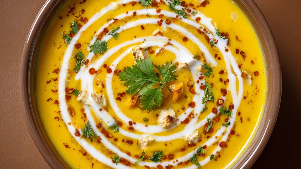 Cremesuppe mit "Tiger-Riesengarnelen" und indischen Kräutern