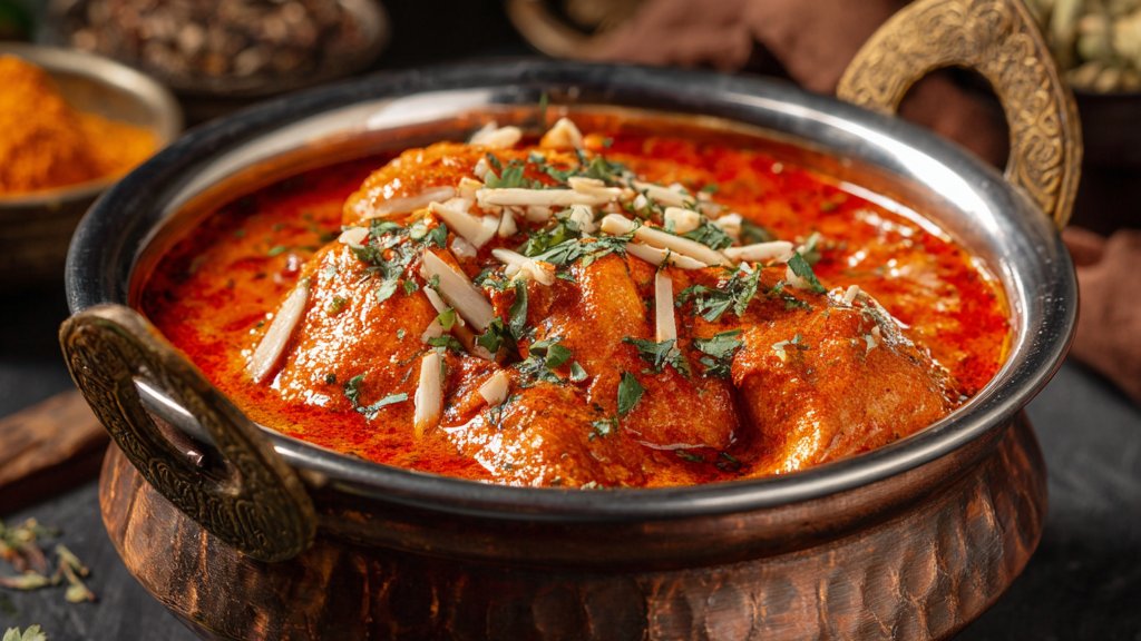 saftige Tandoori-Hähnchenstücke mit leckeren Gewürzen und Nüssen in einer cremigen Tomatensauce