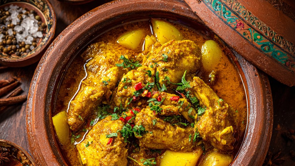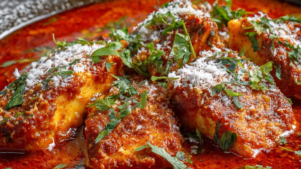 pikantes Hähnchenbrustfilet mit gebackenen kartoffelstücken in einer scharf gewürzten Sauce mit paprika und zwiebeln verfeienert mit kokosraspeln und ist scharf.