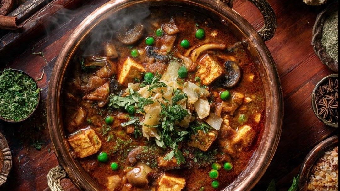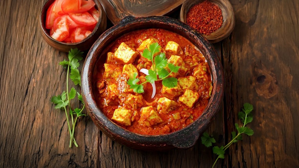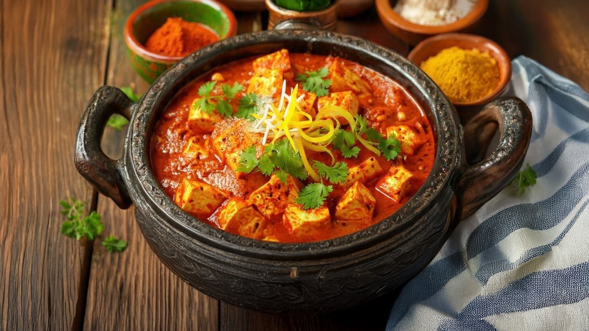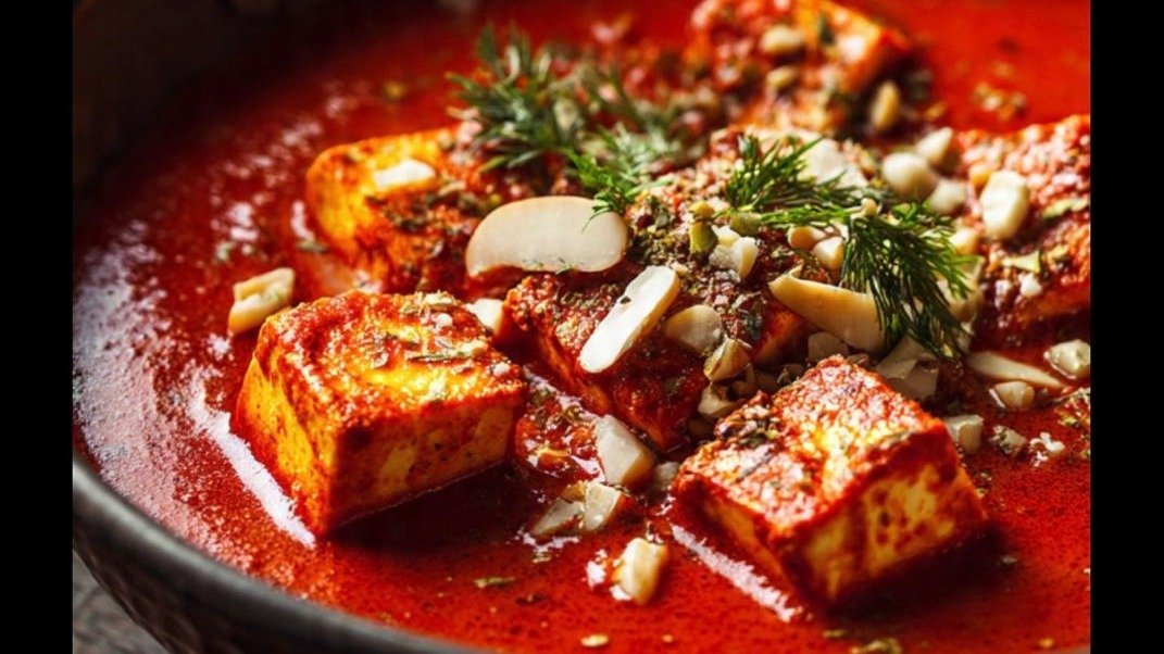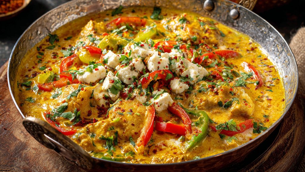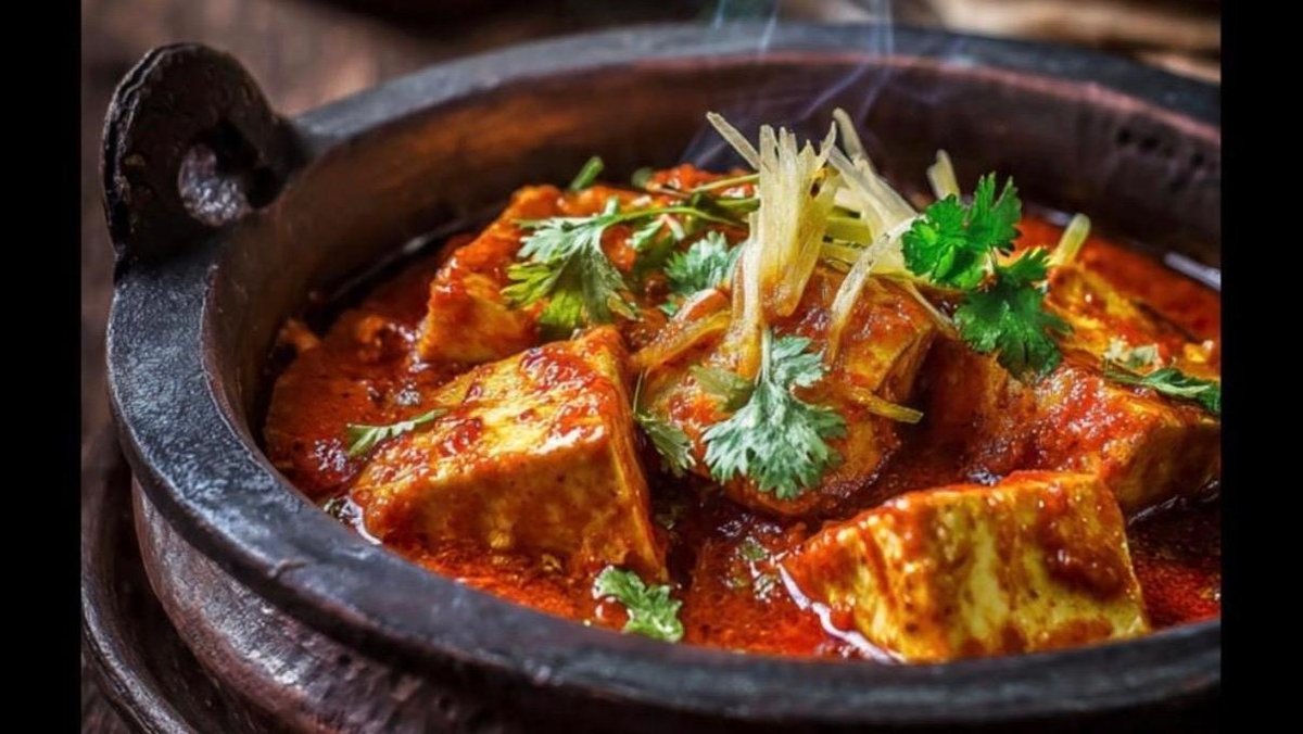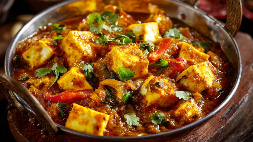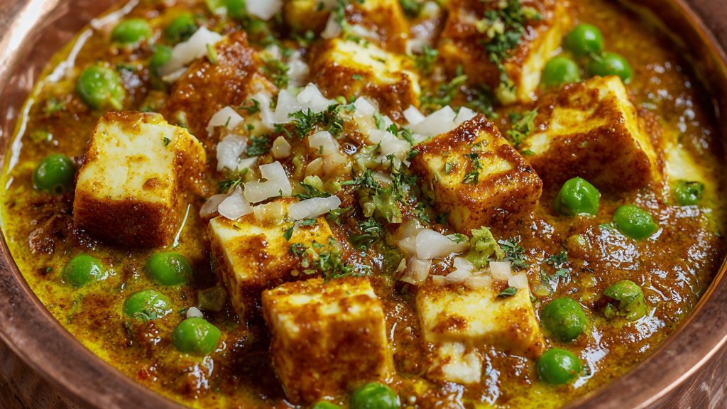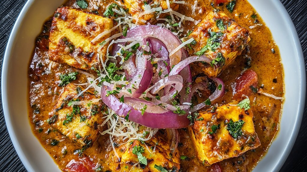 freuen Sie sich auf ein festliches Paneer-Gericht bei dem der hausgemachtes Rahmkäse mit Zwiebeln Tomaten Knoblauch und Chili angebraten wird serviert in einer nussigen cremigen Currysauce