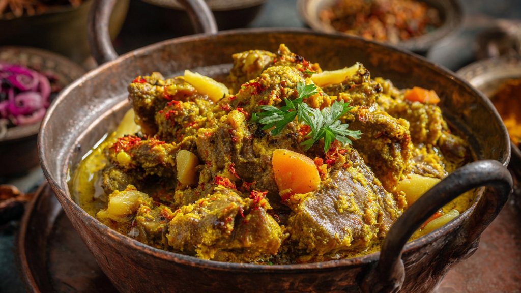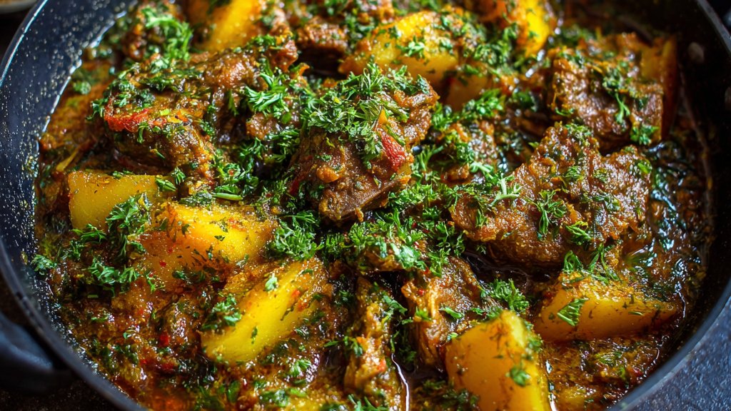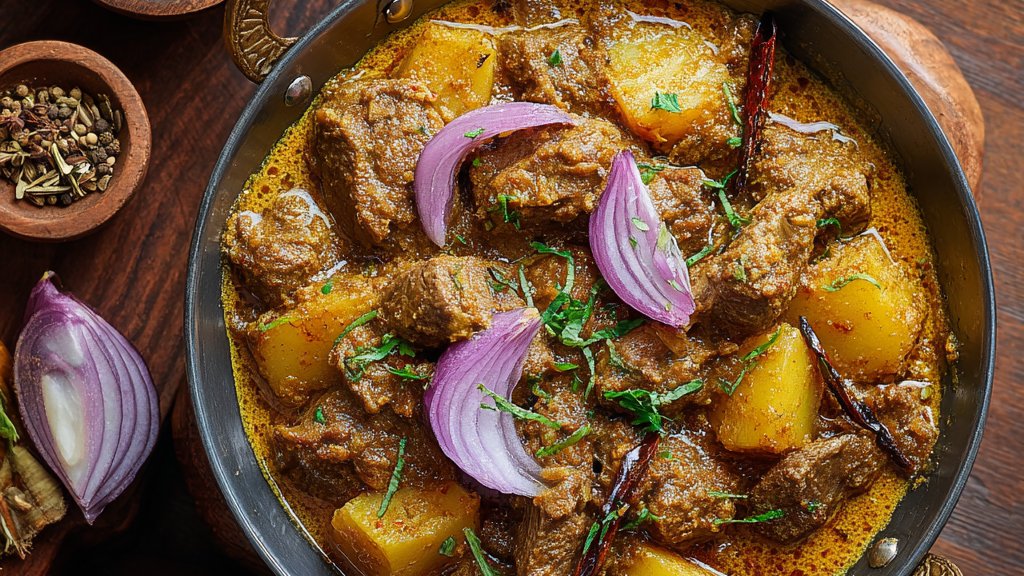 Südindische Lammfleischspezialität mit gebackenen Kartoffeln in einer pikanten Soße