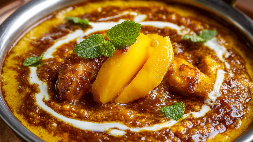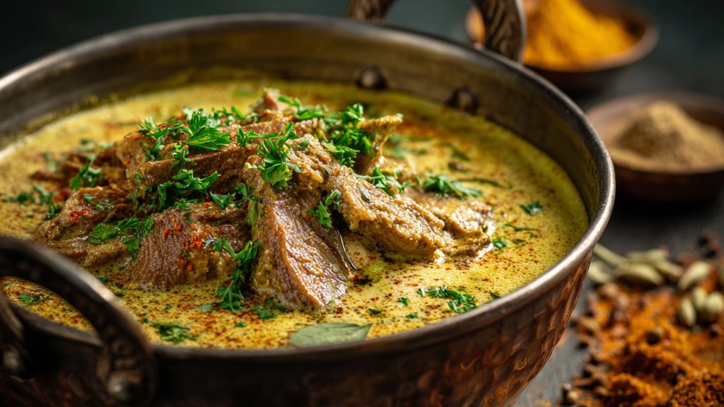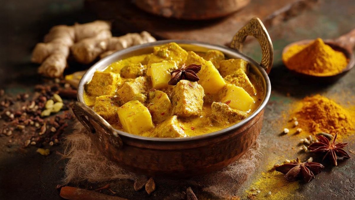 zartes Lammfleisch zubereitet mit einer besonderen Gewürzmischung aus Südindien, abgerundet mit Zwiebeln Kartoffeln und Kokosmilch