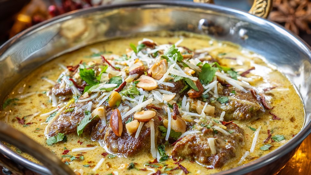indischen Rahmkäse in einer cremigen Sauce aus Mandeln, Cashewnüssen und orientalischen Gewürzen verfeinert mit geriebenem Rahmkäse