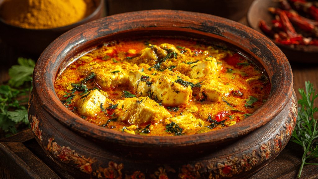 Tofu in einer würzigen Kokos-Currysauce nach köstlicher südindischer Art zubereitet.
