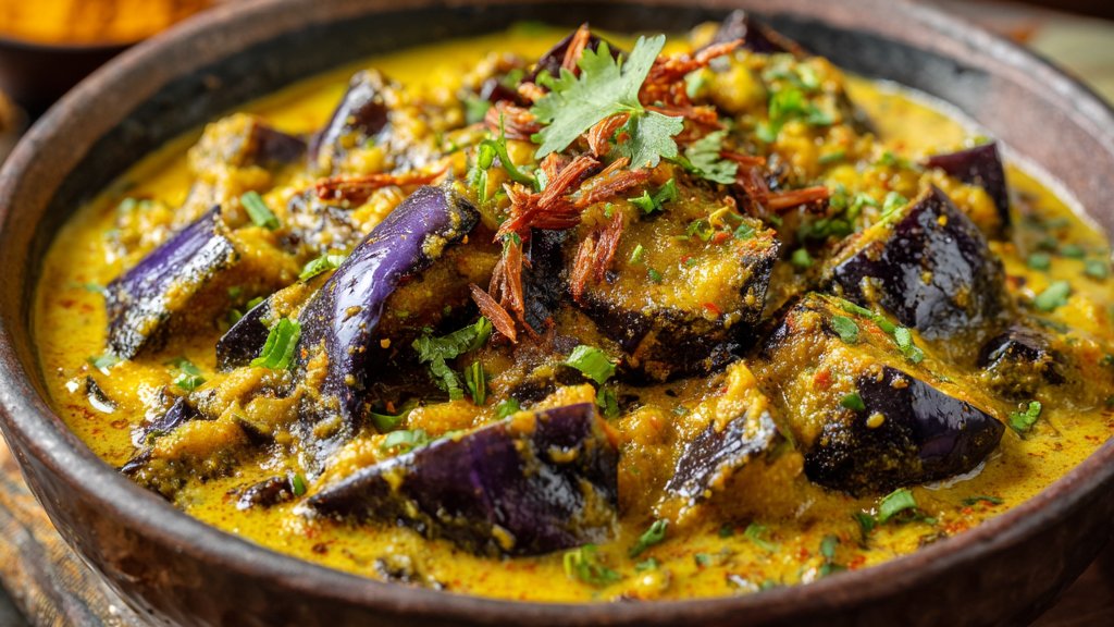 Auberginen-Stückchen gebraten in einer Basal-Gewürzmischung, mit gebackenen Kartoffeln abgerundet mit Kokosmilch