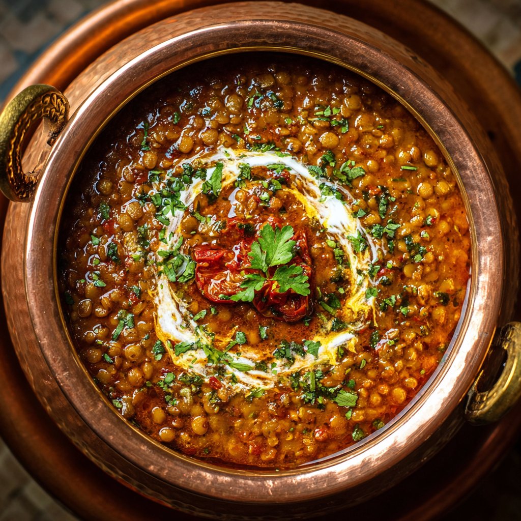 verschiedene Linsen mit Knoblauch frischem Ingwer und Tomaten – eine Nacht lang langsam über dem Lehmofen gegart abgeschmeckt mit Ghee (Indische Butter)