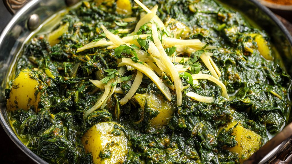 kartoffeln und Spinat mit Zwiebeln und Ingwer gebraten