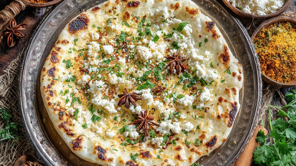 Fladenbrot aus Weizenmehl, im Ofen gebacken mit geriebenem Rahmkäse