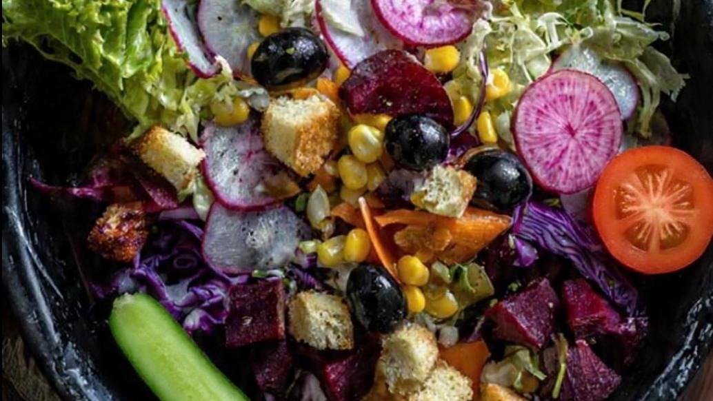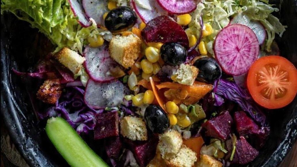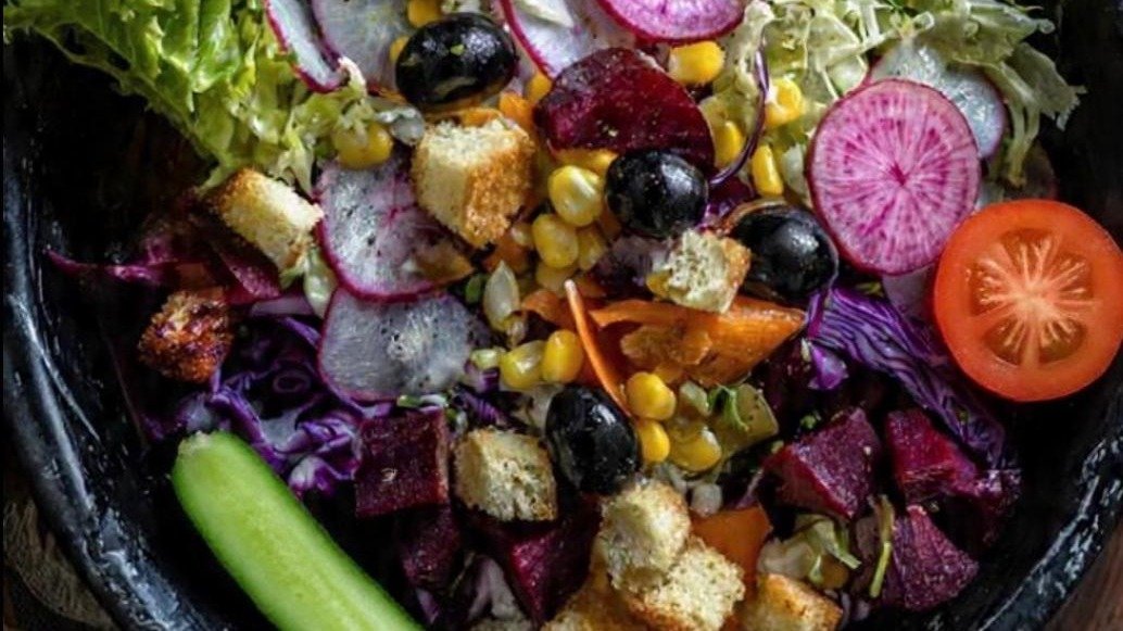 Ein frischer, knackiger Salat mit einer bunten Mischung aus Eisbergsalat, Rotkohl und Weißkohl, kombiniert mit Karotten und roter Beete. Ergänzt wird die Komposition durch süßen Mais, aromatische schwarze Oliven, würzige Peperoni und frische Radieschen. Rucola und Salat sorgen für zusätzliche Frische, während knusprige Croûtons die perfekte Textur für ein rundes Geschmackserlebnis bieten. Der Käse (5/6 Stück) wird in Senföl mariniert und mit Pfeffer, Salz sowie aromatischen indischen Gewürzen verfeinert.