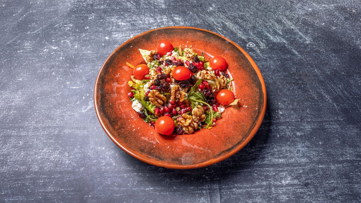 mit gemischtem Salat, Walnüssen, Cranberries, Rosinen, Kirschtomaten, Nomadenkäse, Granatapfelkernen und Granatapfelsirup