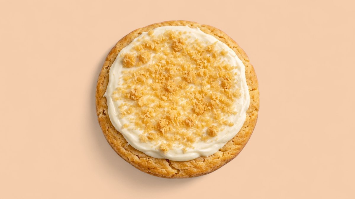 A freshly baked lemon cookie with plant-based lemon pudding cream, topped with Grandma's crumble.