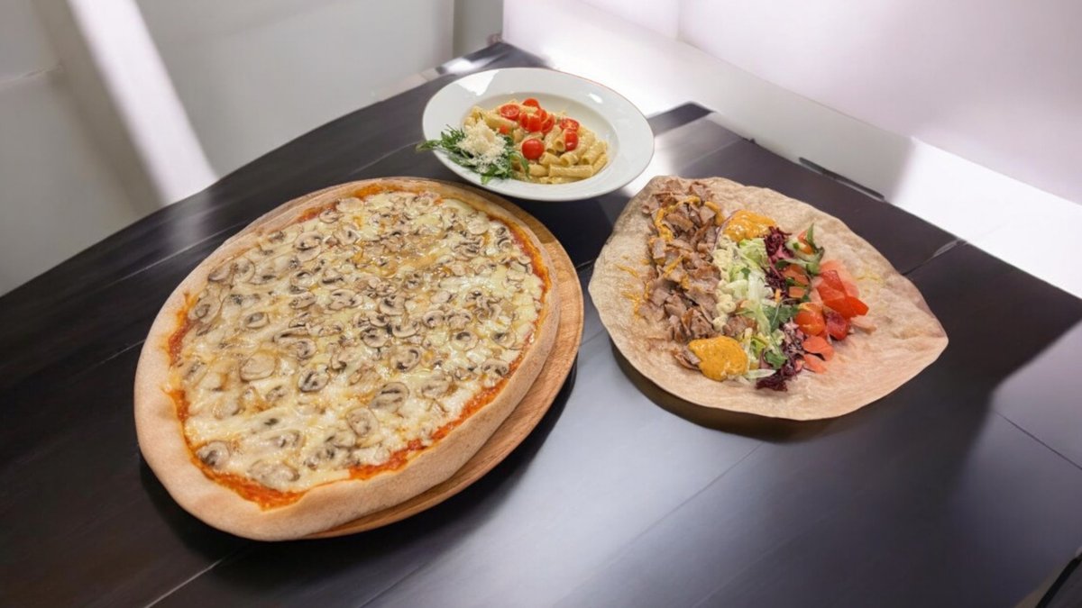 Menü 2: Verwöhnen Sie sich mit saftigem Döner Kebap, knuspriger Pizza & 0,5l kühlendem Getränk. Für Feinschmecker!