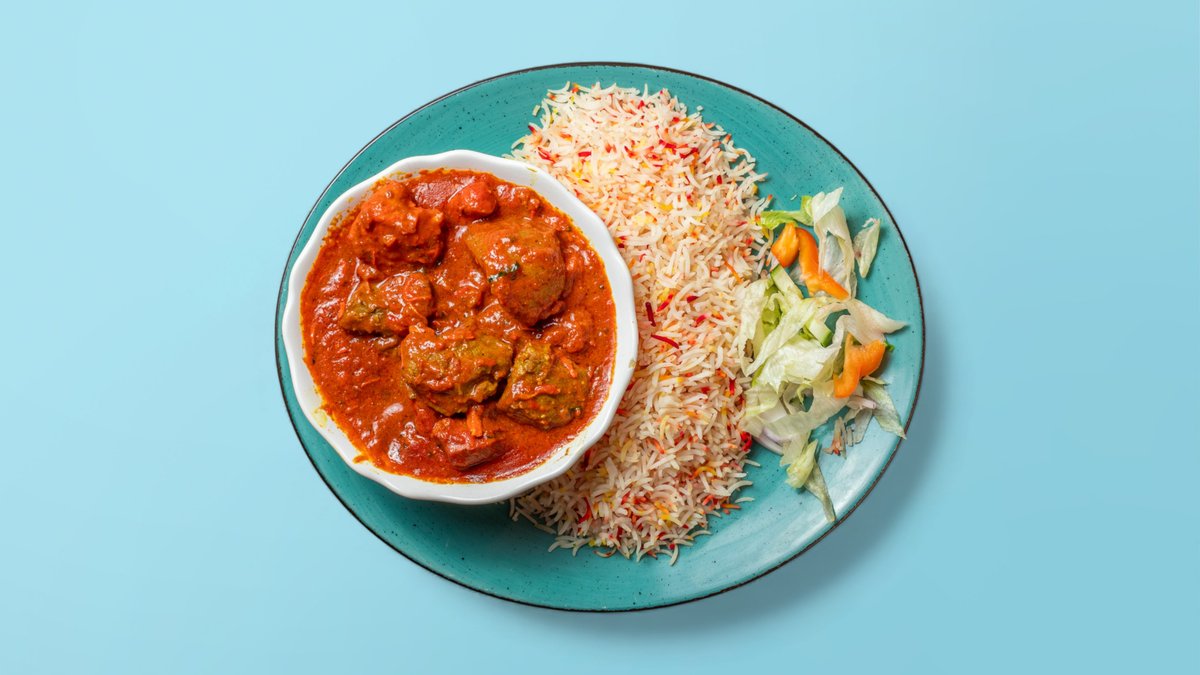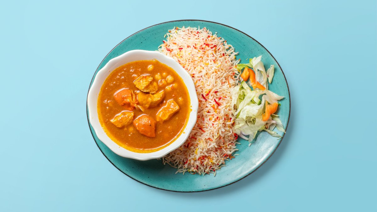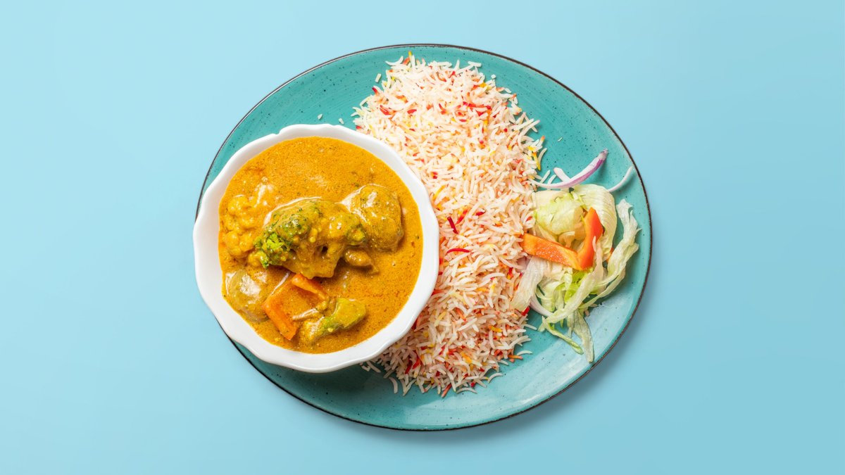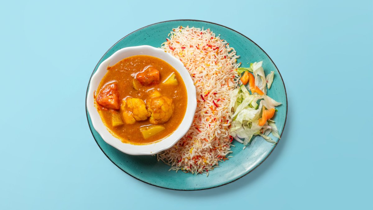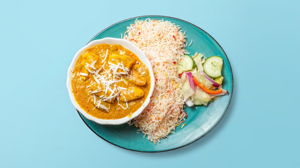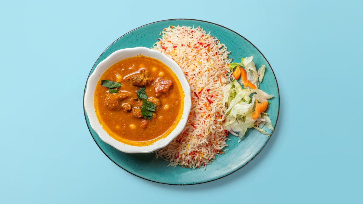 Basmati-Reis mit Lamm-und Hühnerfleisch und Saisongemüse nach traditioneller Art gewürzt