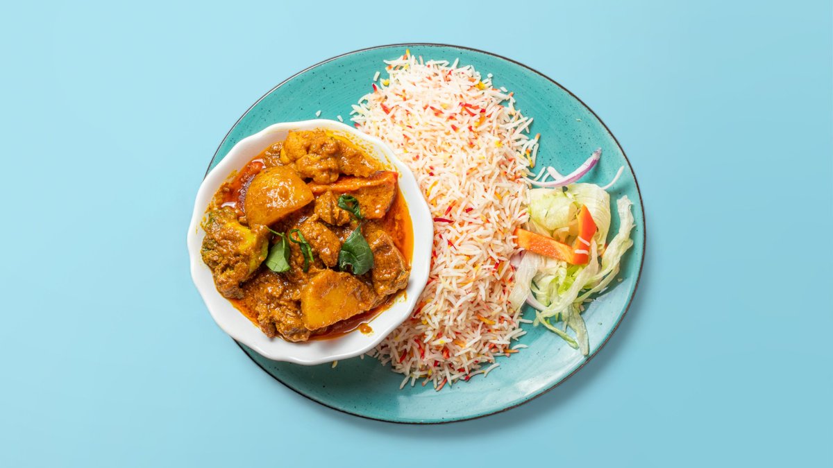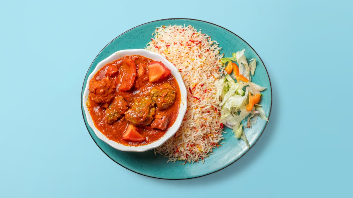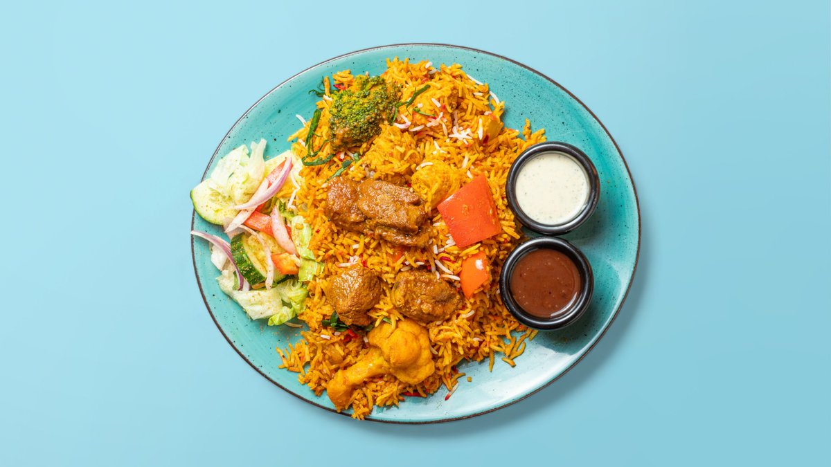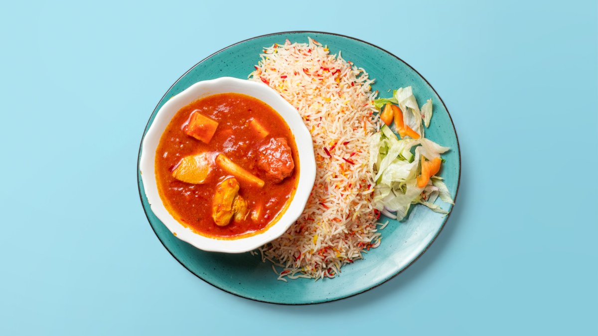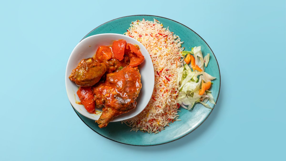 Basmati-Reis mit Lamm-und Hühnerfleisch und Saisongemüse nach traditioneller Art gewürzt