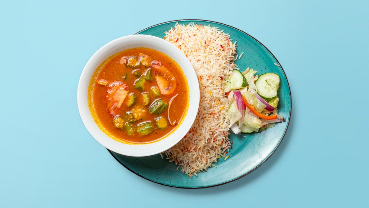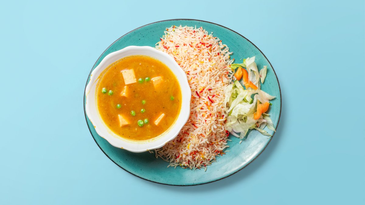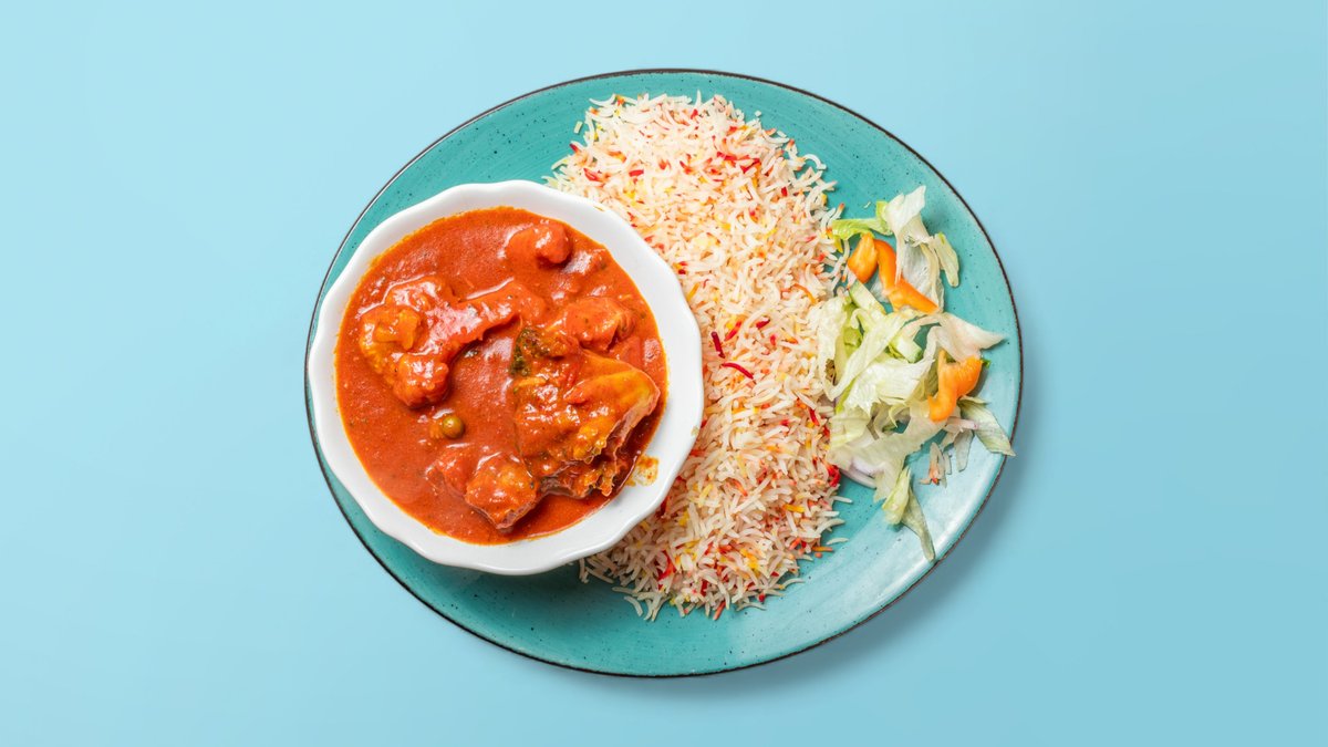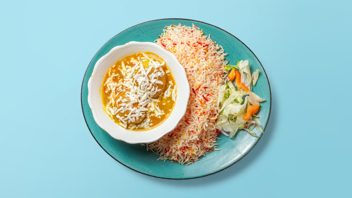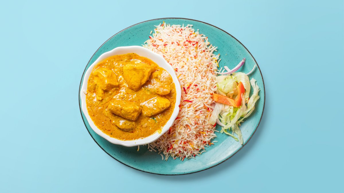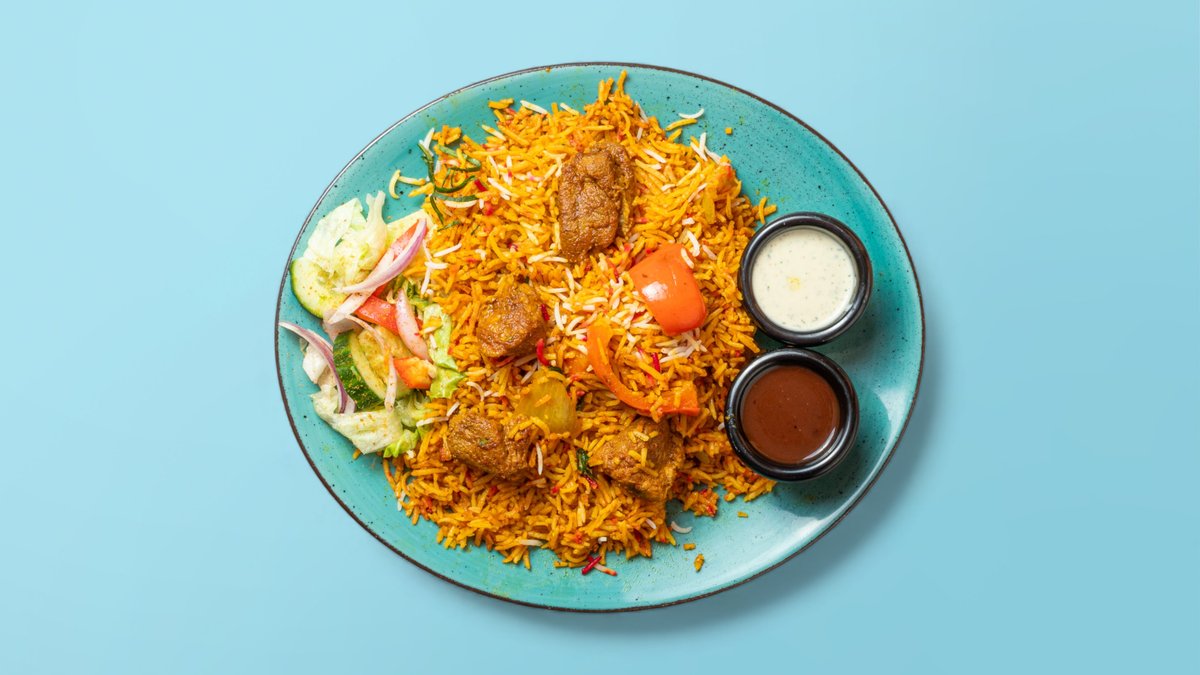Basmati-Reis mit Lamm-und Hühnerfleisch und Saisongemüse nach traditioneller Art gewürzt