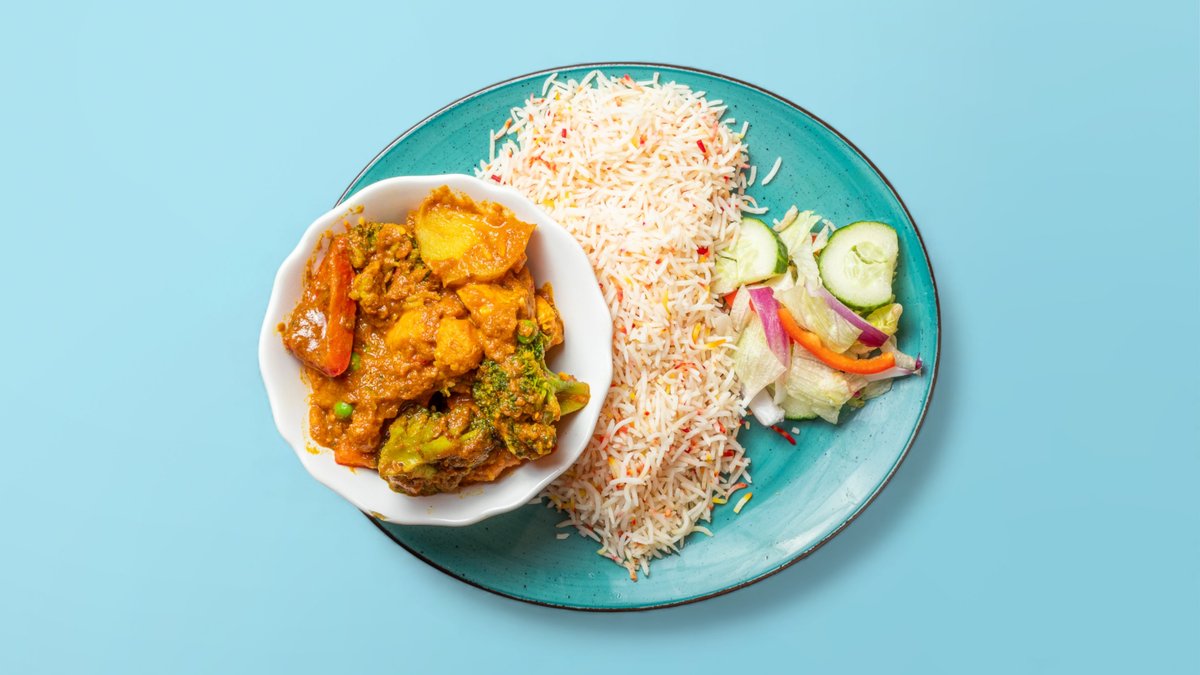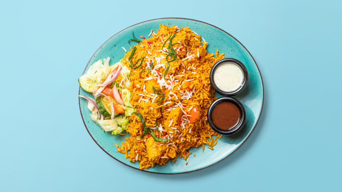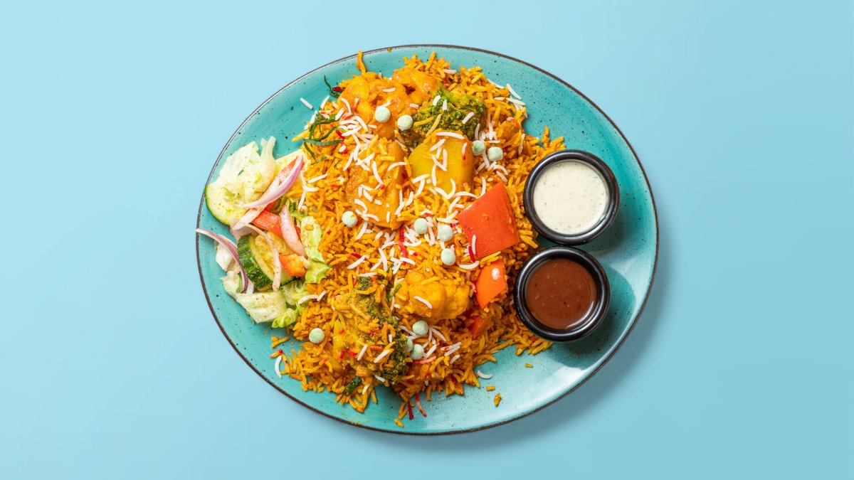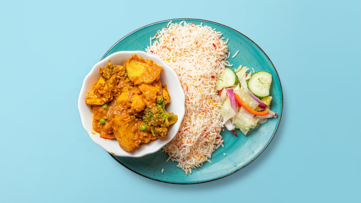 Basmati-Reis mit Hühnerbrustfilet und Saisongemüse nach traditioneller Art gewürzt