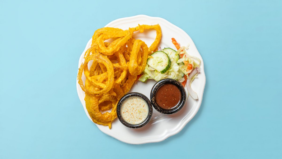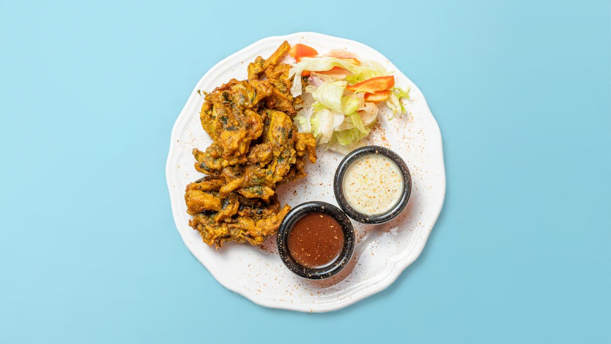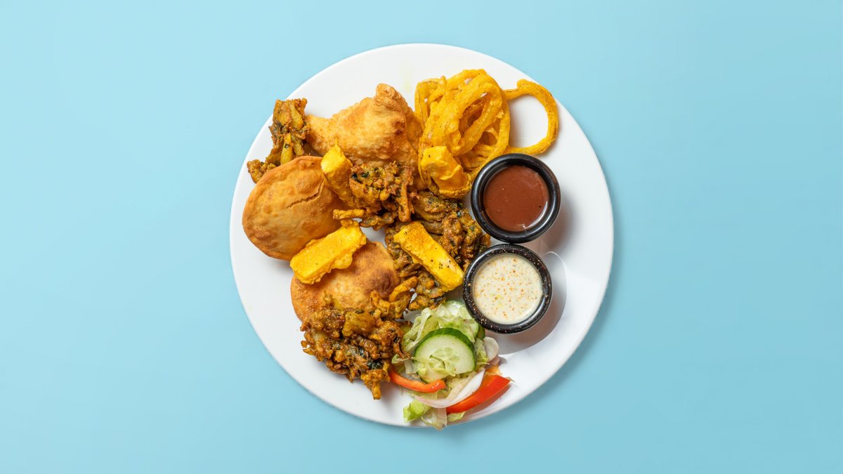 mit Dal Puri, Samosa, Alu Puri, Mix Pakora, Onion Pakora und Paneer Pakora