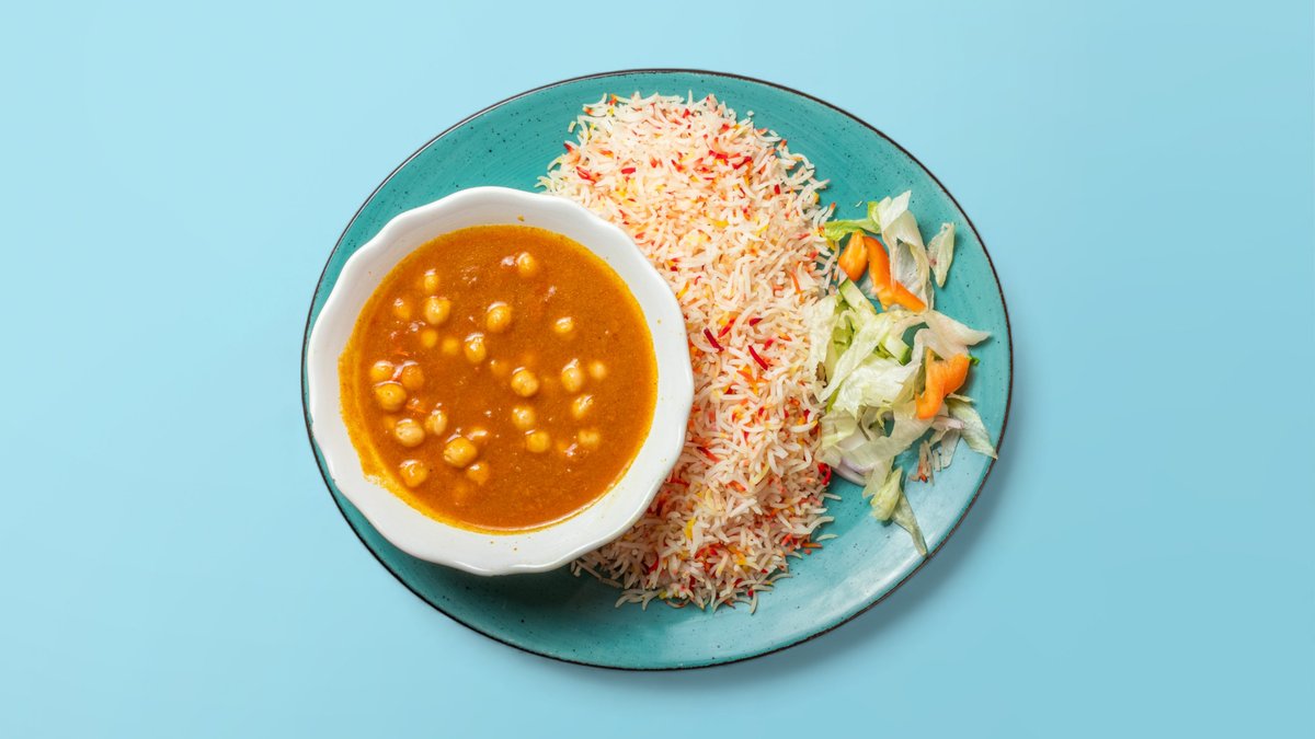 vegan Kichererbsen in pikanter Curry-Masala-Soße mit Beilage nach Wahl