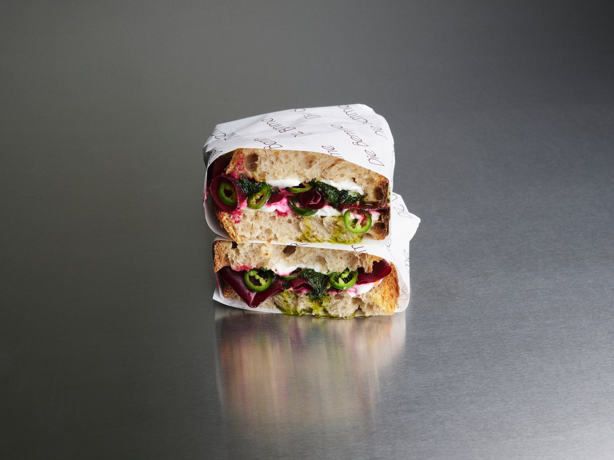 mit Ziegenfrischkäse und Koriander-Limettenblatt-Pesto auf frischem Sauerteigbrot