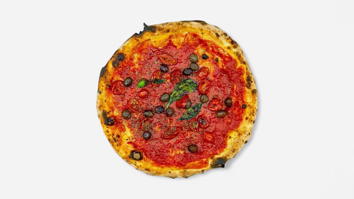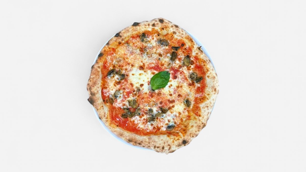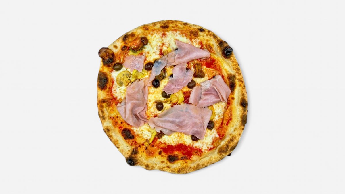 Pizza mit Tomatensoße, Fior di Latte (ital. Mozzarella), Prosciutto Cotto, gebratenen Champignons, gegrillten Artischocken und Oliven